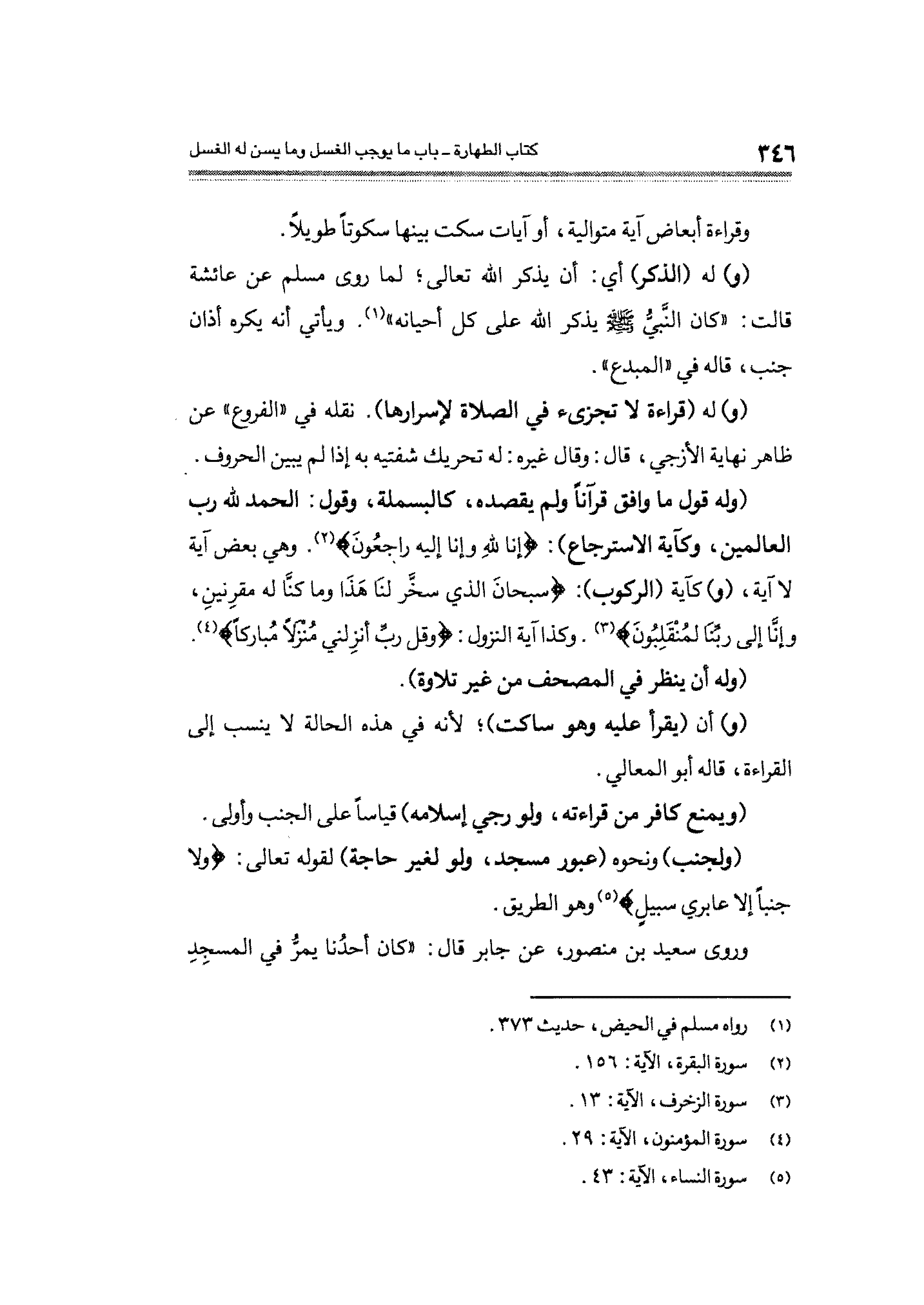 (وله قول ما وافق قرآناً ولم يقصده، كالبسملة، وقول: الحمد لله رب العالمين، وكآية الاسترجاع): {إِنَّا لِلَّهِ وَإِنَّا إِلَيْهِ رَاجِعُونَ} (¬٢). وهي بعض آية لا آية، (و) كآية (الركوب): {سُبْحَانَ الَّذِي سَخَّرَ لَنَا هَذَا وَمَا كُنَّا لَهُ مُقْرِنِينَ (١٣) وَإِنَّا إِلَى رَبِّنَا لَمُنْقَلِبُونَ (١٤)} (¬٣). وكذا آية النزول: {وَقُلْ رَبِّ أَنْزِلْنِي مُنْزَلًا مُبَارَكًا} (¬٤).