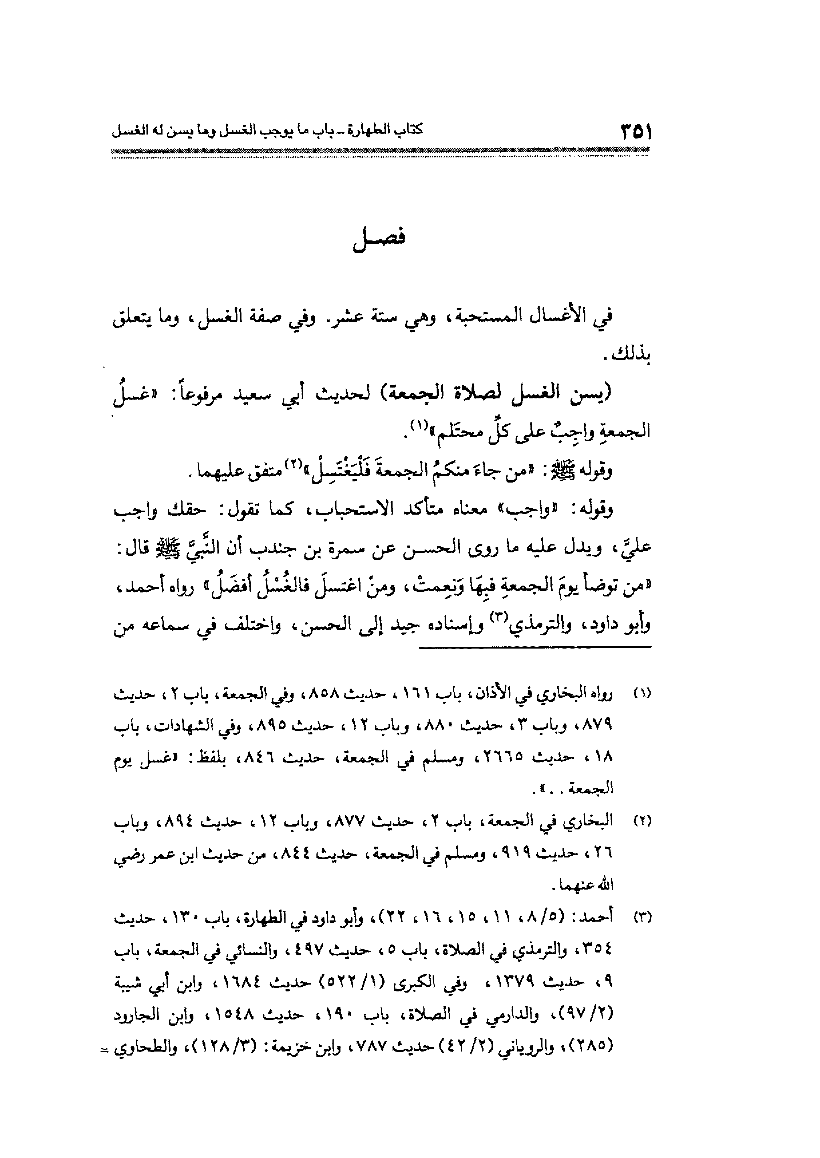 (¬١) رواه البخارى في الأذان، باب ١٦١، حديث ٨٥٨، وفى الجمعة، باب ٢، حديث ٨٧٩، وباب ٣، حديث ٨٨٠، وباب ١٢، حديث ٨٩٥، وفي الشهادات، باب ١٨، حديث ٢٦٦٥، ومسلم في الجمعة، حديث ٨٤٦، بلفظ: "غسل يوم الجمعة .. ".