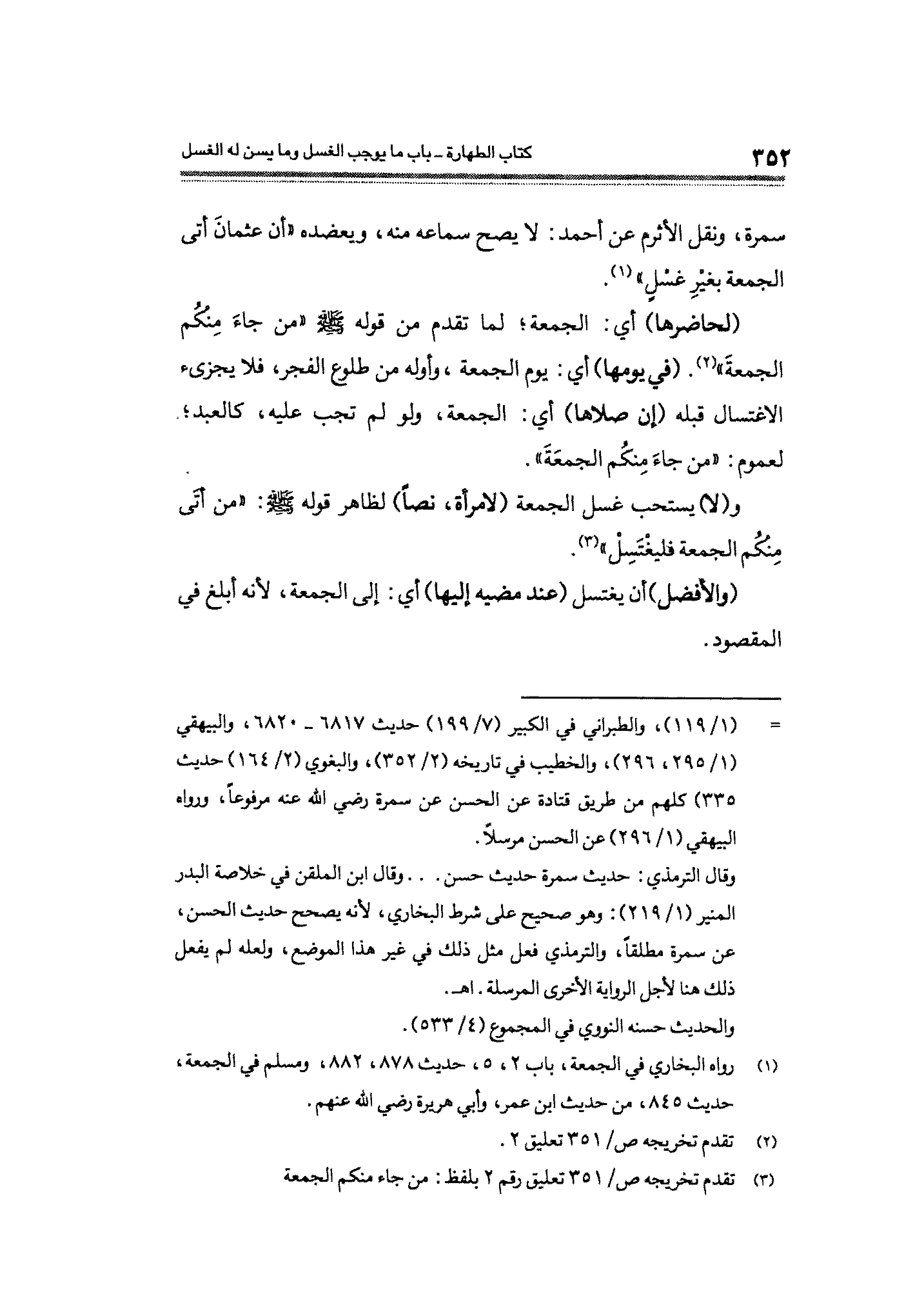 سمرة، ونقل الأثرم عن أحمد: لا يصح سماعه منه، ويعضده "أن عثمانَ أتى الجمعة بغيرِ غسْلٍ" (¬١).
