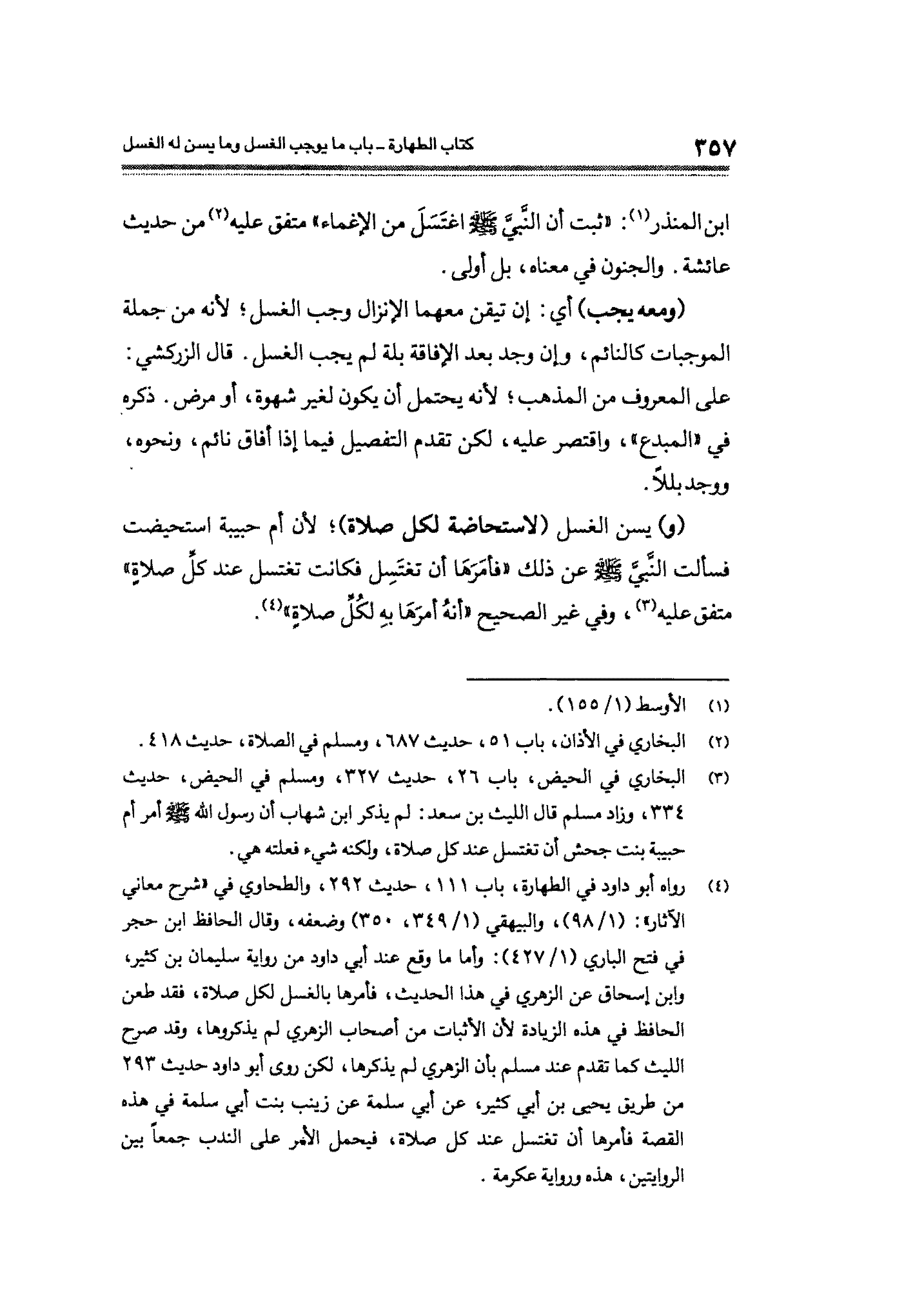 (و) يسن الغسل (لاستحاضة لكل صلاة)؛ لأن أم حبيبة استحيضت فسألت النَّبيَّ - صلى الله عليه وسلم - عن ذلك "فأمَرَهَا أن تغتَسِل فكانت تغتسل عند كلِّ صلاةٍ" متفق عليه (¬٣)، وفي غير الصحيح "أنهُ أمرَهَا بِهِ لكُلِّ صلاةٍ" (¬٤).