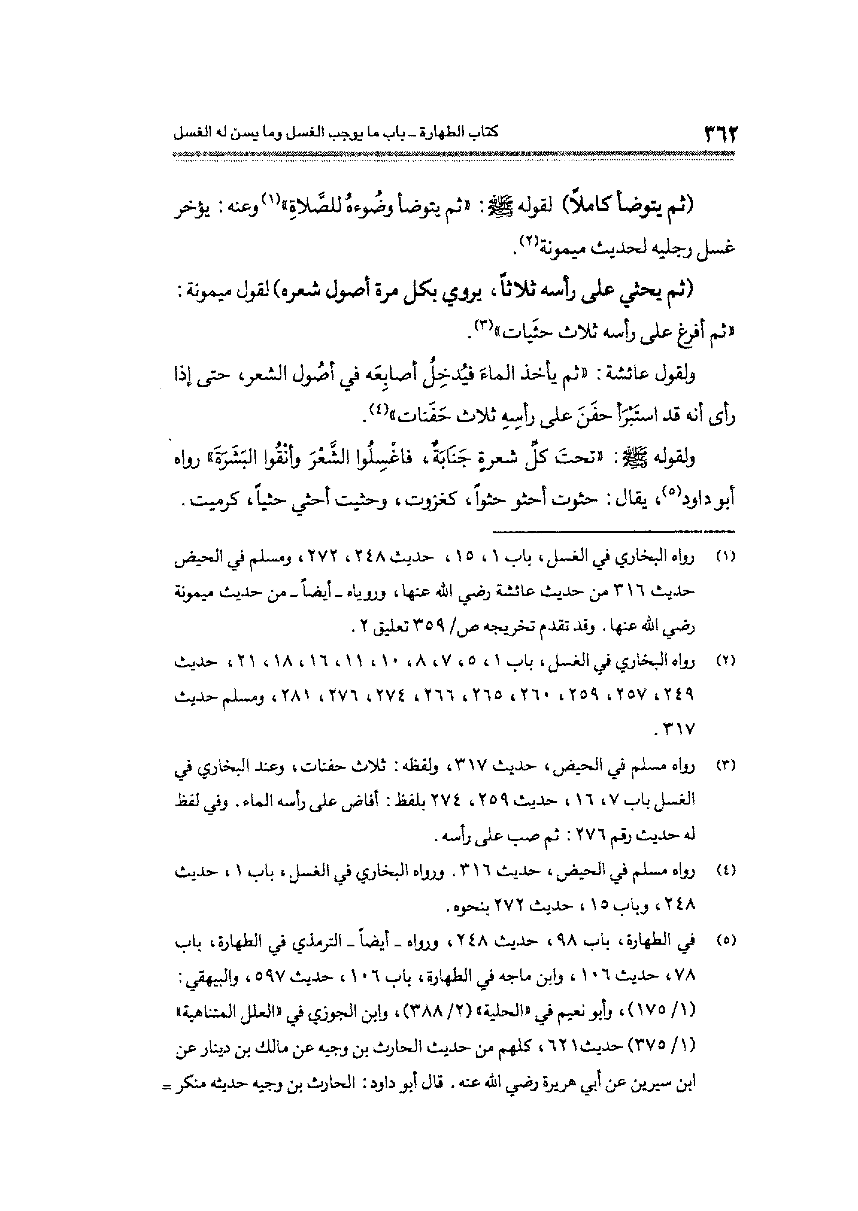 (¬١) رواه البخاري في الغسل، باب ١، ١٥، حديث ٢٤٨، ٢٧٢، ومسلم في الحيض حديث ٣١٦ من حديث عائشة رضي الله عنها، وروياه - أيضًا - من حديث ميمونة رضي الله عنها. وقد تقدم تخريجه ص/ ٣٥٩ تعليق ٢.