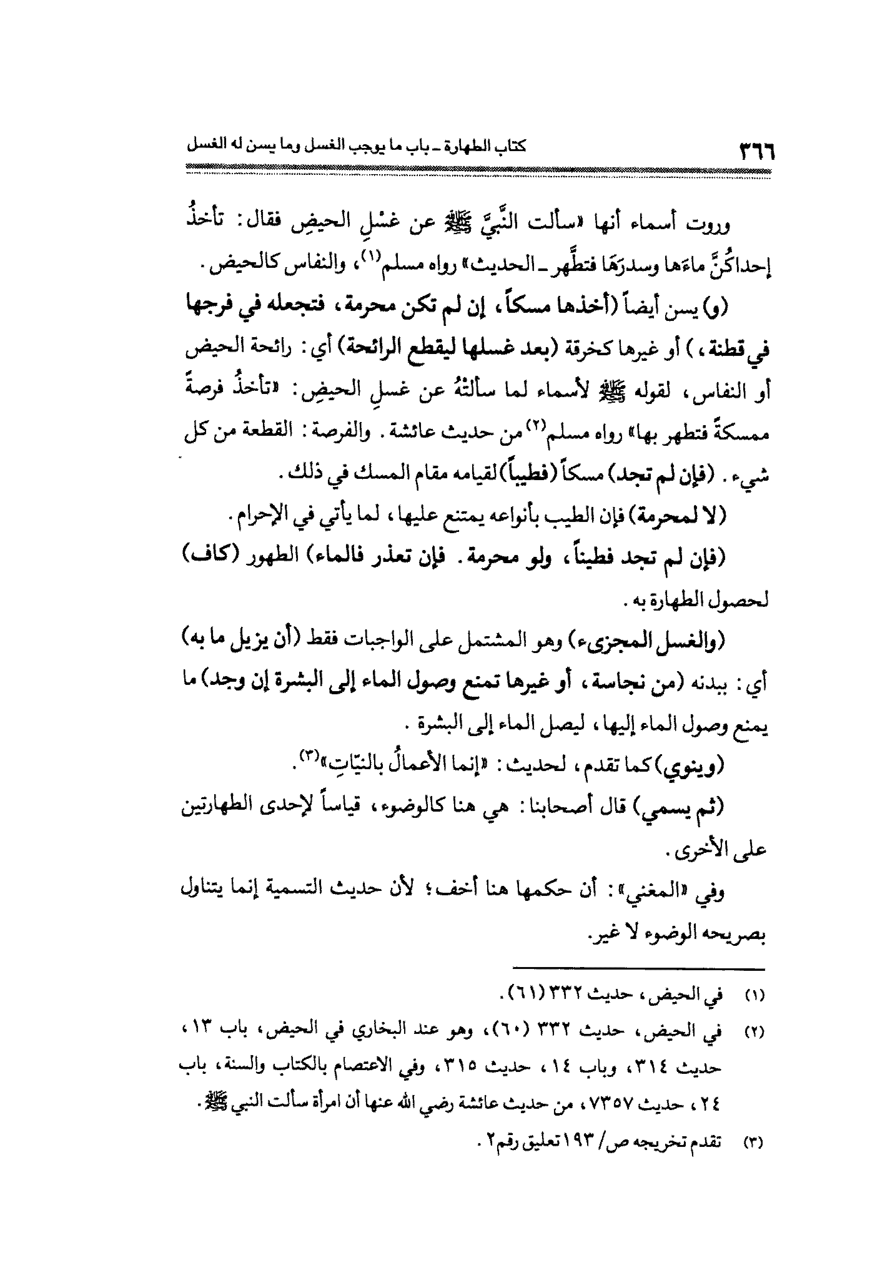 (¬٢) في الحيض، حديث ٣٣٢ (٦٠)، وهو عند البخاري في الحيض، باب ١٣، حديث ٣١٤، وباب ١٤، حديث ٣١٥، وفي الاعتصام بالكتاب والسنة، باب ٢٤، حديث ٧٣٧٥، من حديث عائشة رضي الله عنها أن امرأة سألت النبي - صلى الله عليه وسلم -.