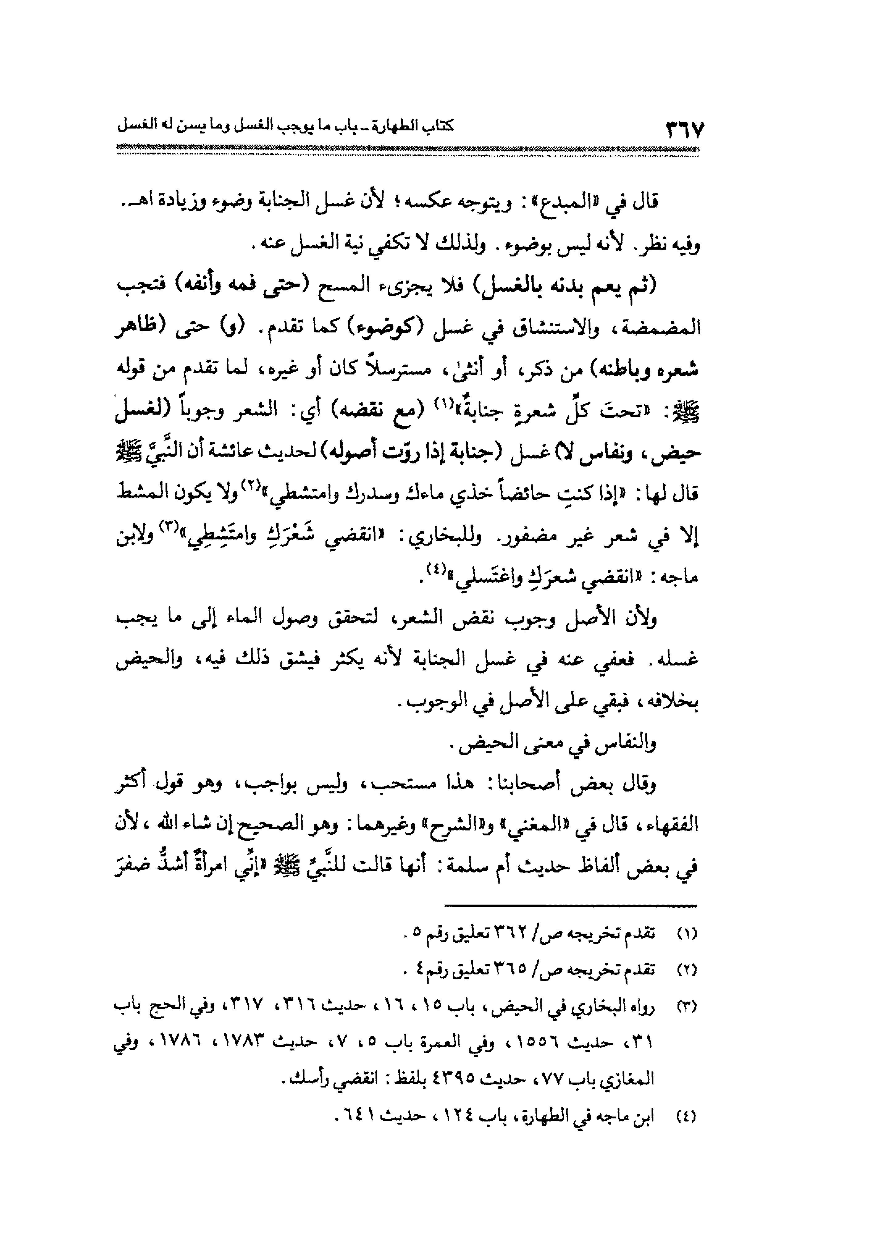 وقال بعض أصحابنا: هذا. مستحب، وليس بواجب، وهو قول أكثر الفقهاء، قال في "المغني" و"الشرح" وغيرهما: وهو الصحيح إن شاء الله، لأن في بعض ألفاظ حديث أم سلمة: أنها قالت للنَّبيِّ - صلى الله عليه وسلم - "إنِّي امرأةٌ أشدُّ ضفرَ