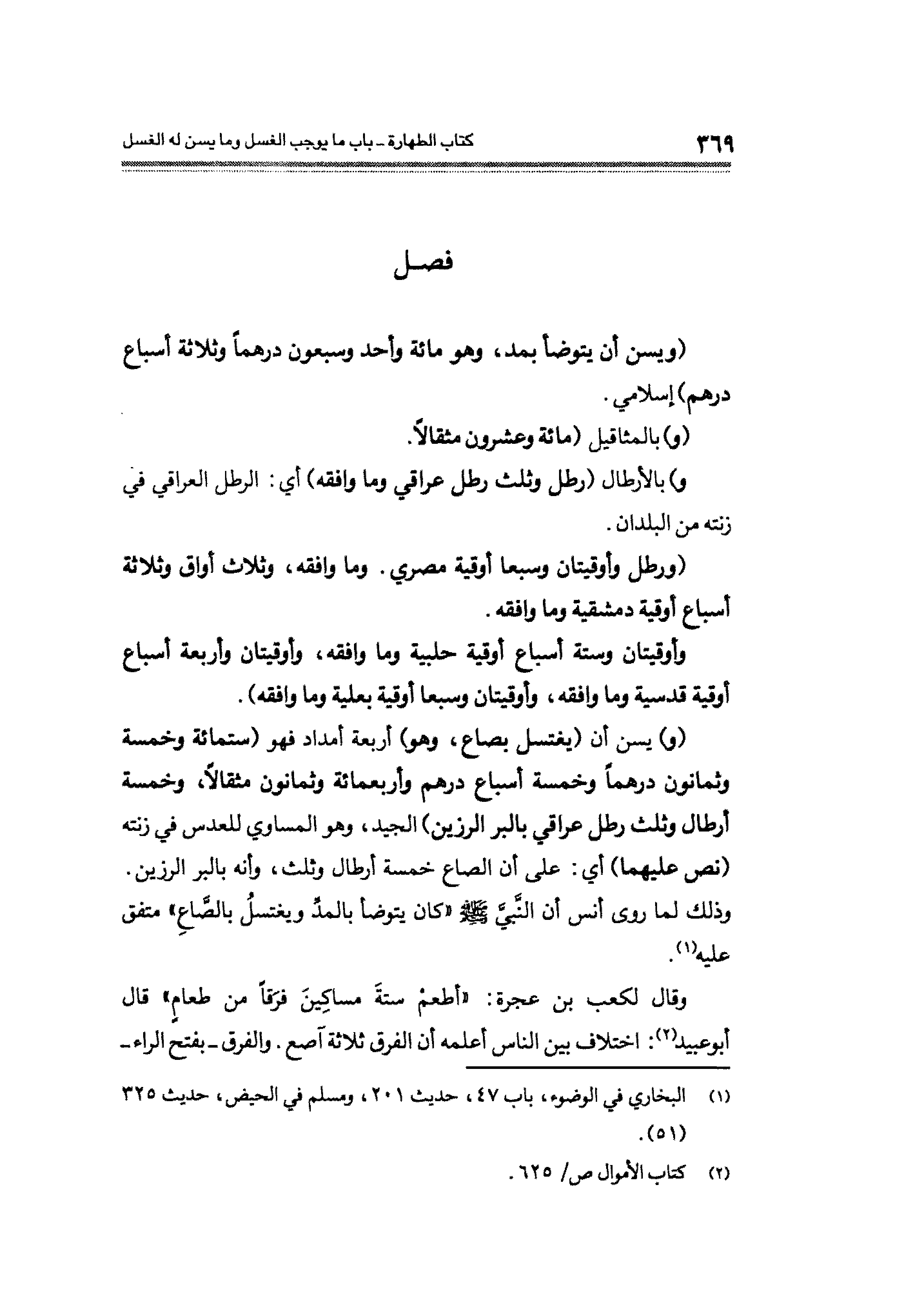 (و) يسن أن (يغتسل بصاع، وهو) أربعة أمداد فهو (ستمائة وخمسة وثمانون درهمًا وخمسة أسباع درهم وأربعمائة وثمانون مثقالاً، وخمسة أرطال وثلث رطل عراقي بالبر الرزين) الجيد، وهو المساوى للعدس في زنته (نص عليهما) أي: على أن الصاع خمسة أرطال وثلث، وأنه بالبر الرزين. وذلك لما روى أنس أن النَّبيَّ - صلى الله عليه وسلم -، كان يتوضأ بالمدِّ ويغتسلُ بالصَّاعِ" متفق عليه (¬١).