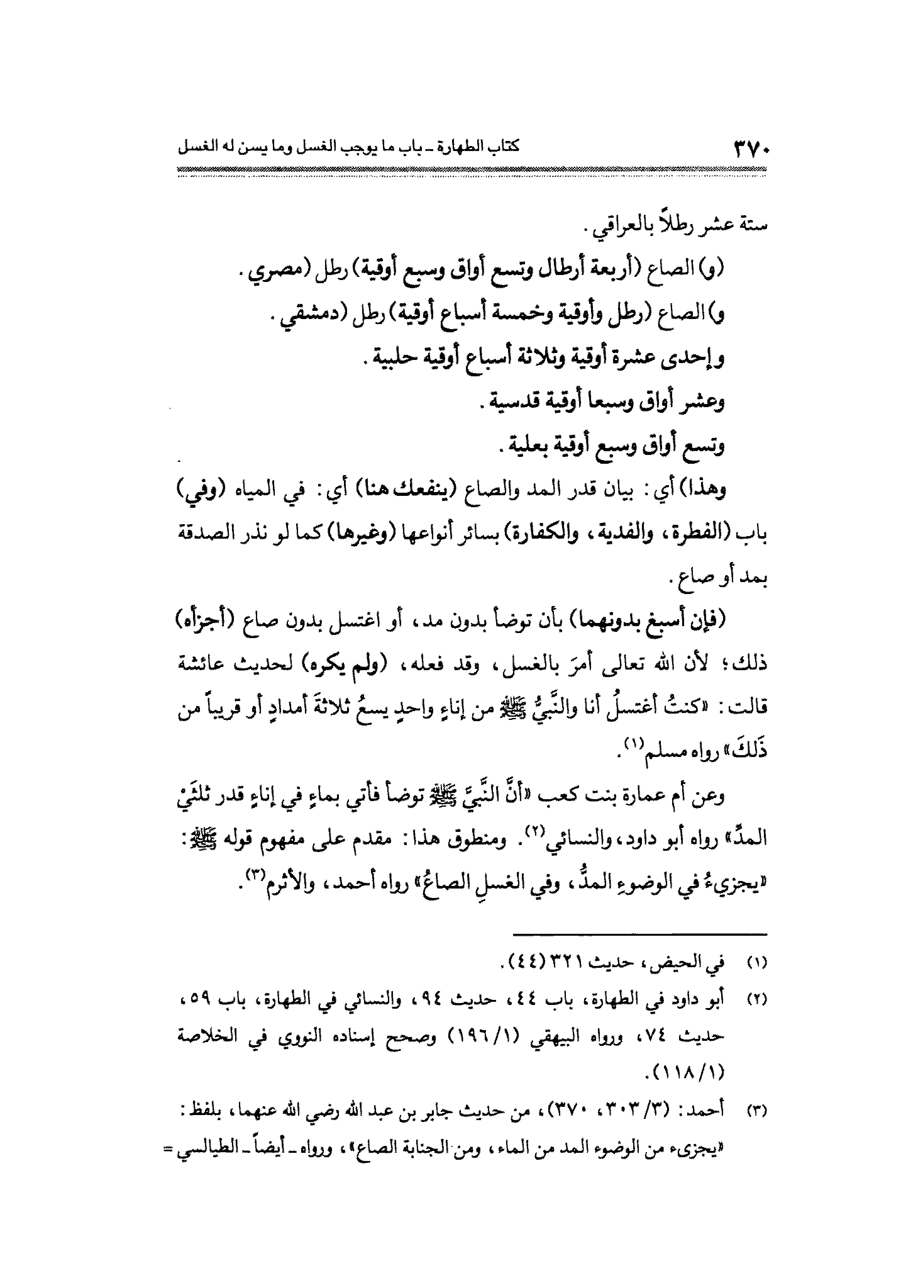 (¬٣) أحمد: (٣/ ٣٠٣، ٣٧٠)، من حديث جابر بن عبد الله رضي الله عنهما، بلفظ: "يجزئ من الوضوء المد من الماء، ومن الجنابة الصاع"، ورواه- أيضًا- الطيالسي=