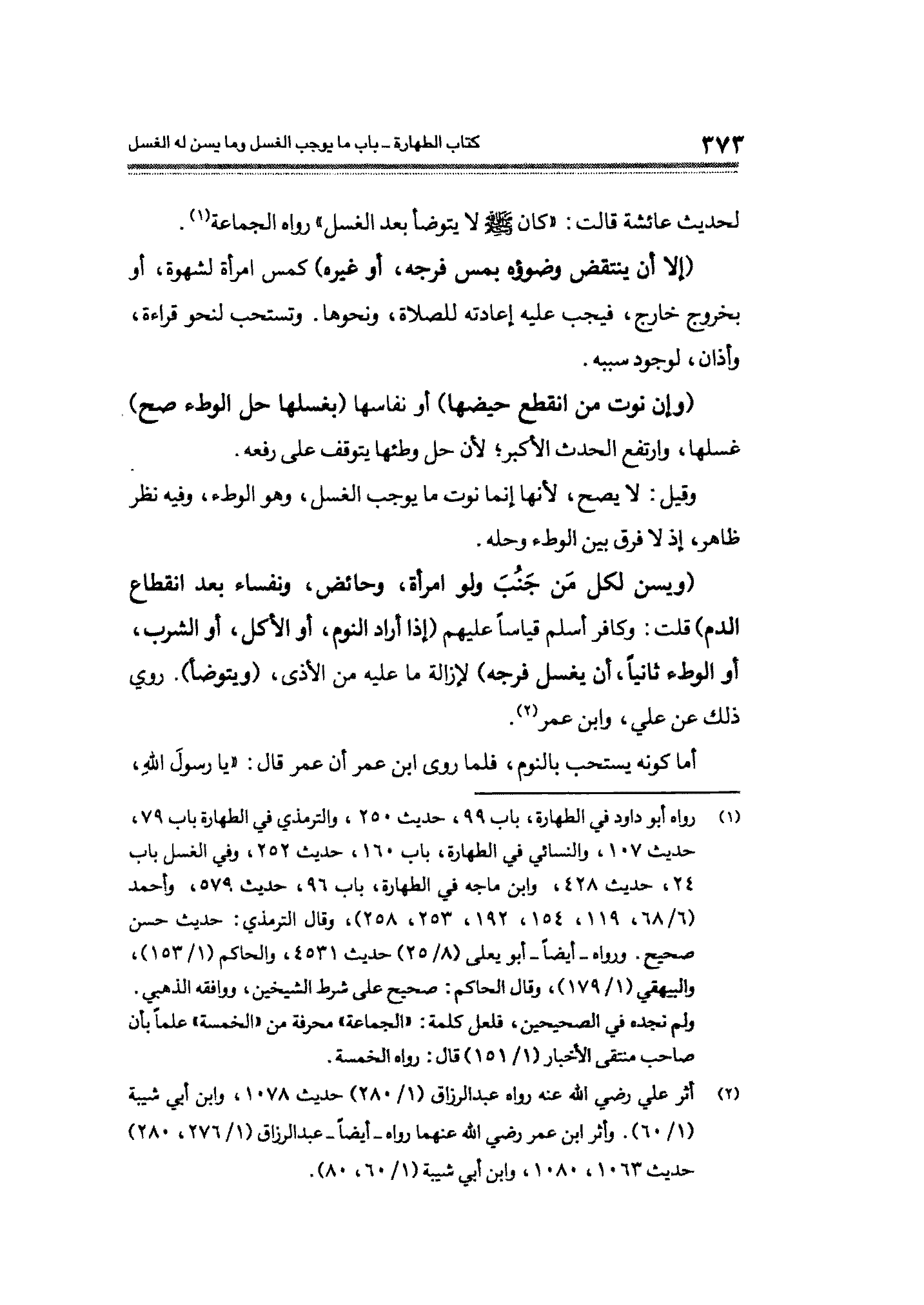(ويسن لكل مَن جَنُبَ ولو امرأة، وحائض، ونفساء بعد انقطاع الدم) قلت: وكافر أسلم قياسًا عليهم (إذا أراد النوم، أو الأكل، أو الشرب، أو الوطء ثانيًا، أن يغسل فرجه) لإزالة ما عليه من الأذي، (ويتوضأ). روى ذلك عن علي، وابن عمر (¬٢).