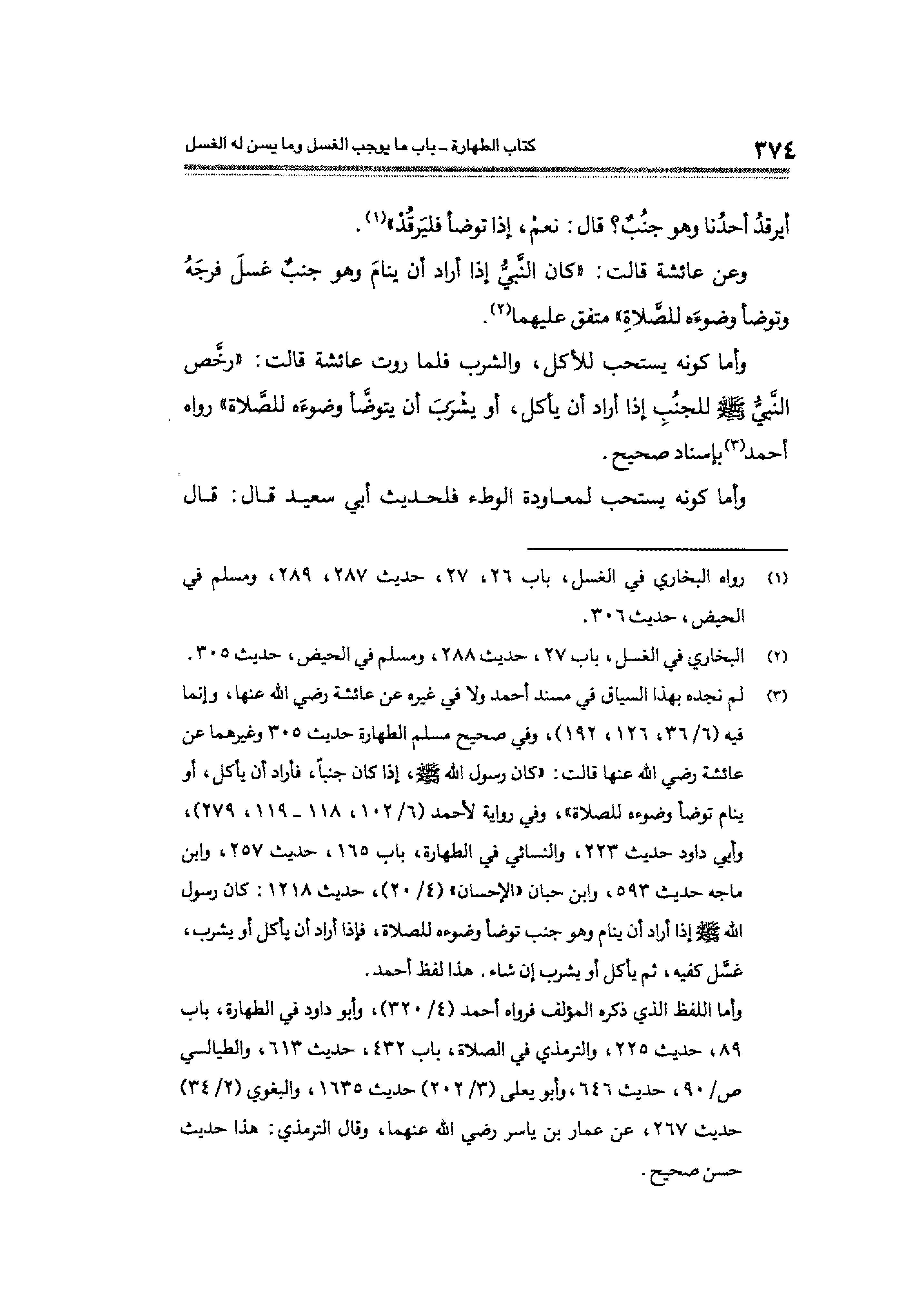 (¬٣) لم نجده بهذا السياق في مسند أحمد ولا في غيره عن عائشة رضي الله عنها، وإنما فيه (٦/ ٣٦، ١٢٦، ١٩٢)، وفي صحيح مسلم الطهارة حديث ٣٠٥ وغيرهما عن عائشة رضي الله عنها قالت: "كان رسول الله - صلى الله عليه وسلم -، إذا كان جنبًا، فأراد أن يأكل، أو ينام توضأ وضوءه للصلاة"، وفي رواية لأحمد (٦/ ١٠٢، ١١٨ - ١١٩، ٢٧٩)، وأبي داود حديث ٢٢٣، والنسائي في الطهارة، باب ١٦٥، حديث ٢٥٧، وابن ماجه حديث ٥٩٣، وابن حبان "الإحسان" (٤/ ٢٠)،حديث ١٢١٨: كان رسول الله - صلى الله عليه وسلم - إذا أراد أن ينام وهو جنب توضأ وضوءه للصلاة، فإذا أراد أن يأكل أو يشرب، غسَّل كفيه، ثم يأكل أو شرب إن شاء. هذا لفظ أحمد.