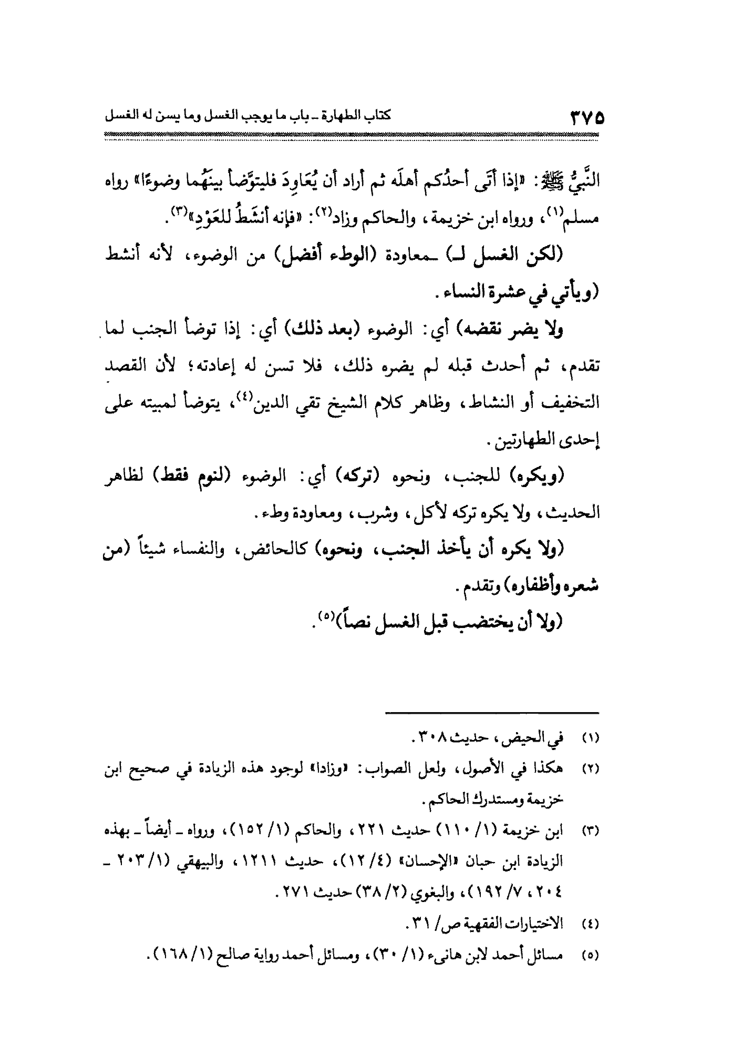 النَّبيُّ - صلى الله عليه وسلم -: "إذا أتَى أحدُكم أهلَهْ ثم أراد أن يُعَاوِدَ فليتوَّضأ بينَهُما وضوءًا" رواه مسلم (¬١)، ورواه ابن خزيمة، والحاكم وزاد (¬٢): "فإنه أنشَطُ للعَوْدِ" (¬٣).