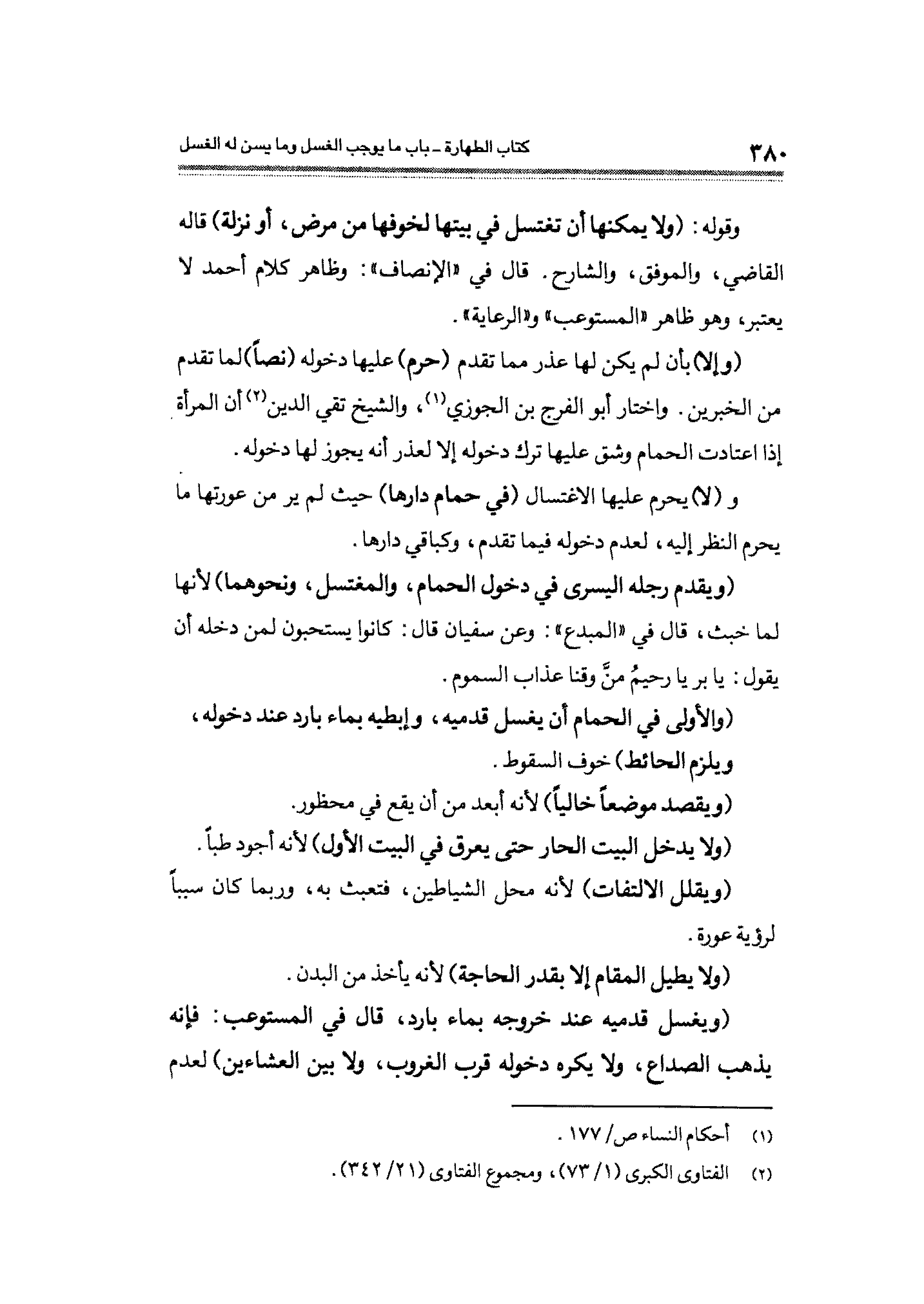وقوله: (ولا يمكنها أن تغتسل في بيتها لخوفها من مرض، أو نزلة) قاله القاضي، والموفق، والشارح. قال في "الإنصاف": وظاهر كلام أحمد لا يعتبر، وهو ظاهر "المستوعب" و "الرعاية".