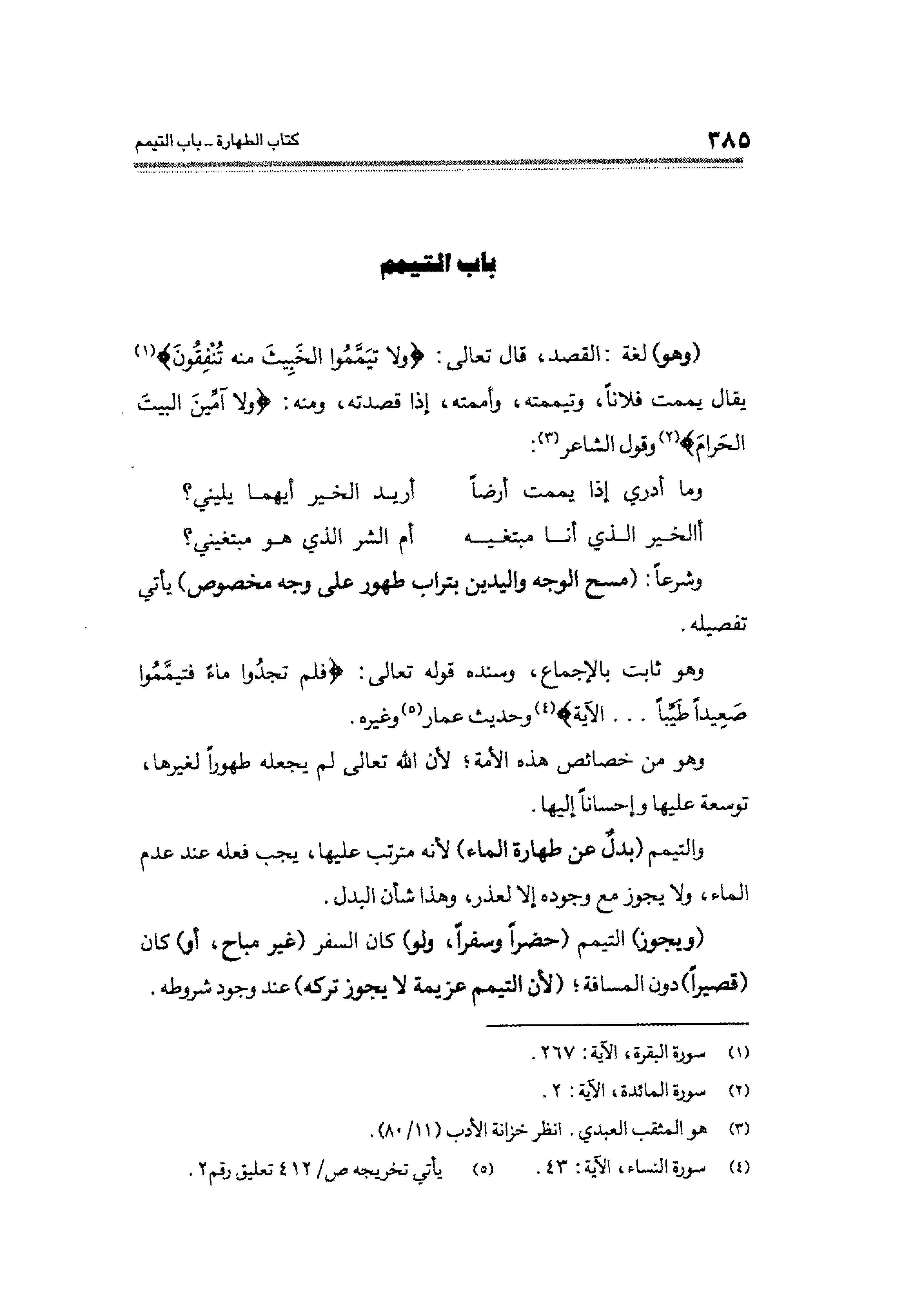 (وهو) لغة: القصد، قال تعالى: {وَلَا تَيَمَّمُوا الْخَبِيثَ مِنْهُ تُنْفِقُونَ} (¬١) يقال يممت فلانًا، وتيممته، وأممته، إذا قصدته، ومنه: {وَلَا آمِّينَ الْبَيْتَ الْحَرَامَ} (¬٢) وقول الشاعر (¬٣):