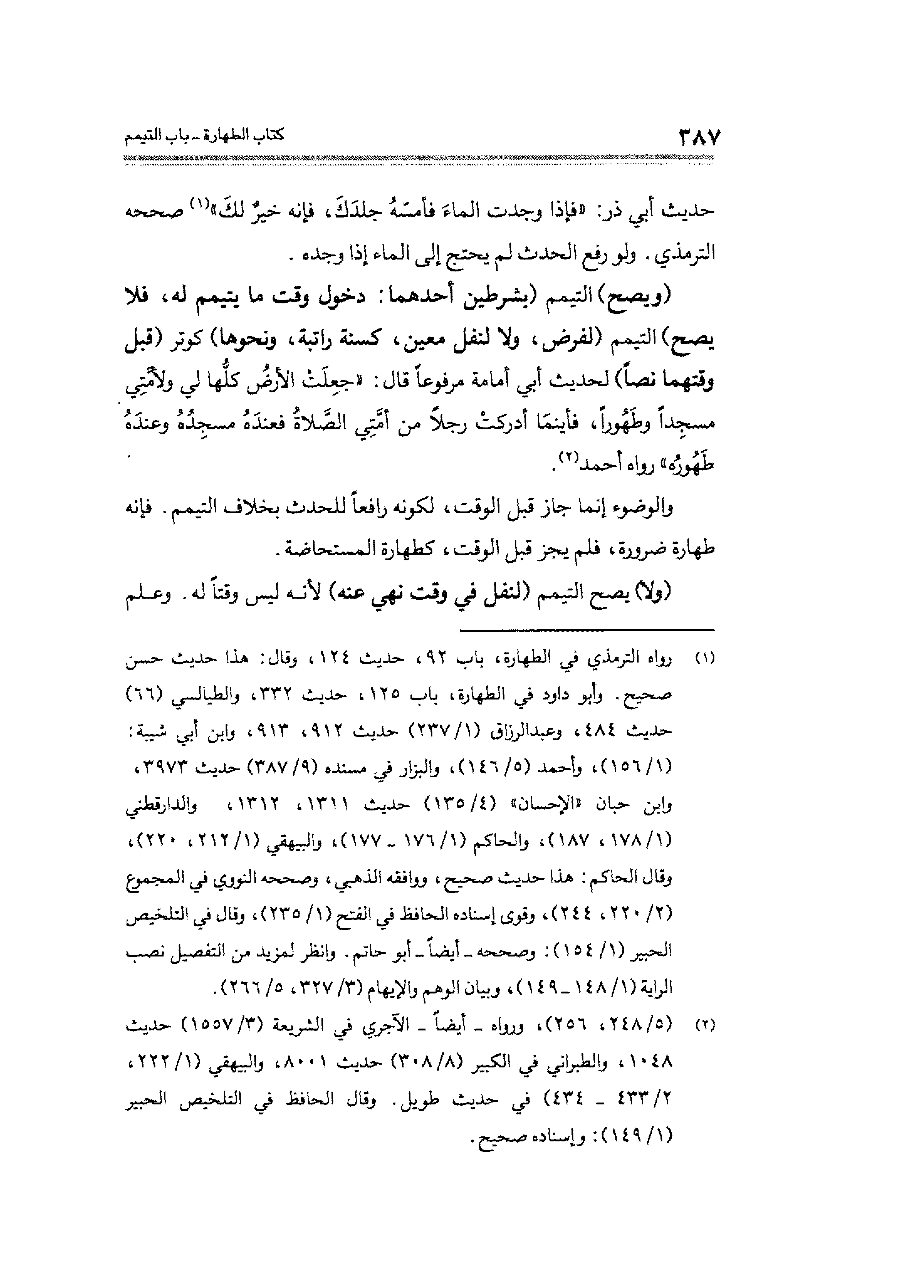 (ويصح) التيمم (بشرطين أحدهما: دخول وقت ما يتيمم له، فلا يصح) التيمم (لفرض، ولا لنفل معين، كسنة راتبة، ونحوها) كوتر (قبل وقتهما نصًا) لحديث أبي أمامة مرفوعًا قال: "جعِلَتْ الأرضُ كلُّها لي ولأمَّتِي مسجِدًا وطَهُورًا، فأينمَا أدركتْ رجلًا من أمَّتِي الصَّلاةُ فعندَهُ مسجِدُهُ وعندَهُ طَهُورُه" رواه أحمد (¬٢).
