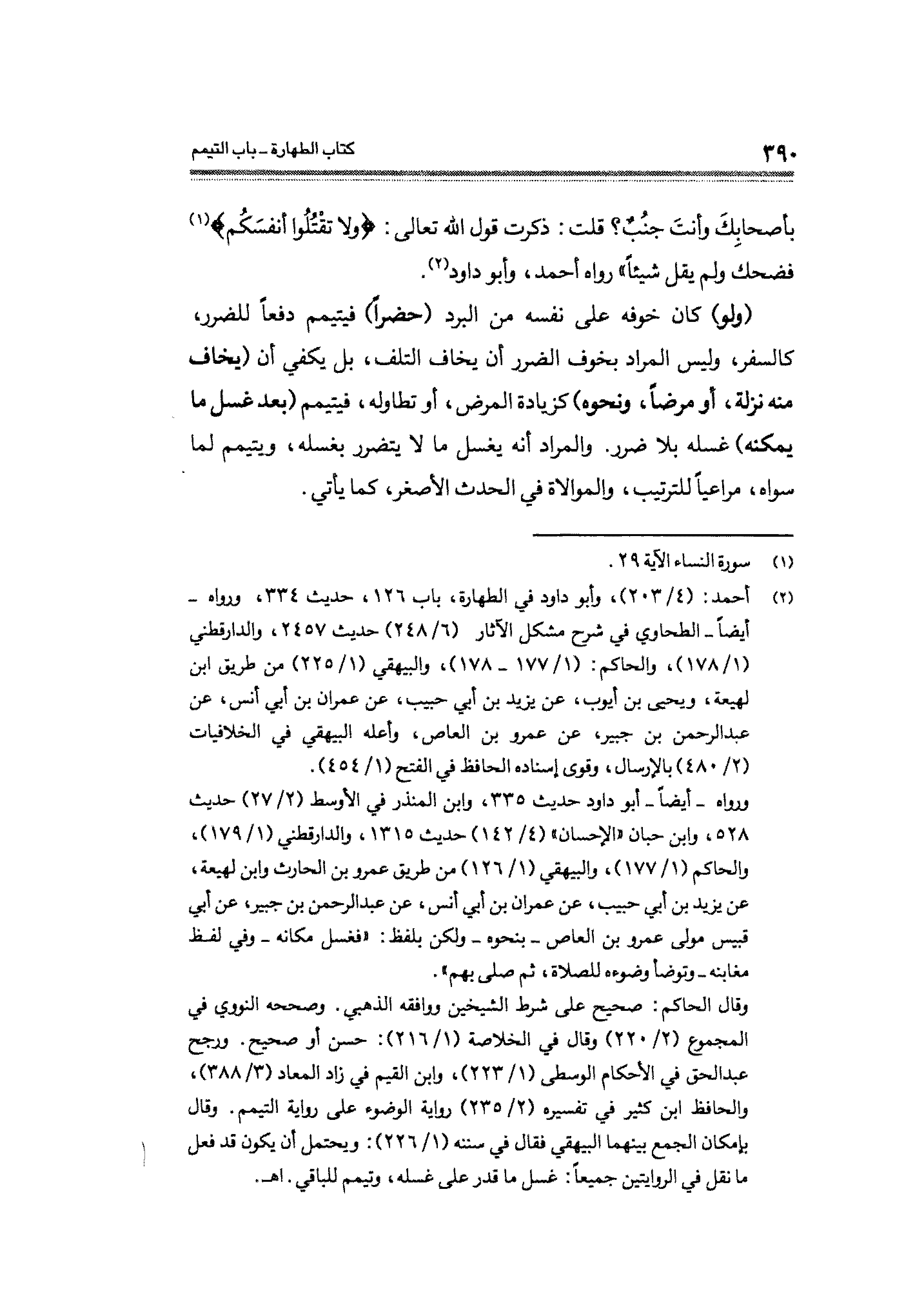 وقال الحاكم: صحيح على شرط الشيخين ووافقه الذهبي. وصححه النووي في المجموع (٢/ ٢٢٠) وقال في الخلاصة (١/ ٢١٦): حسن أو صحيح. ورجح عبد الحق في الأحكام الوسطى (١/ ٢٢٣)، وابن القيم في زاد المعاد (٣/ ٣٨٨)، والحافظ ابن كثير في تفسيره (٢/ ٢٣٥) رواية الوضوء على رواية التيمم. وقال بإمكان الجمع بينهما البيهقي فقال في سنته (١/ ٢٢٦): ويحتمل أن يكون قد فعل ما نقل في الروايتين جميعًا: غسل ما قدر على غسله، وتيمم للباقي. اهـ.