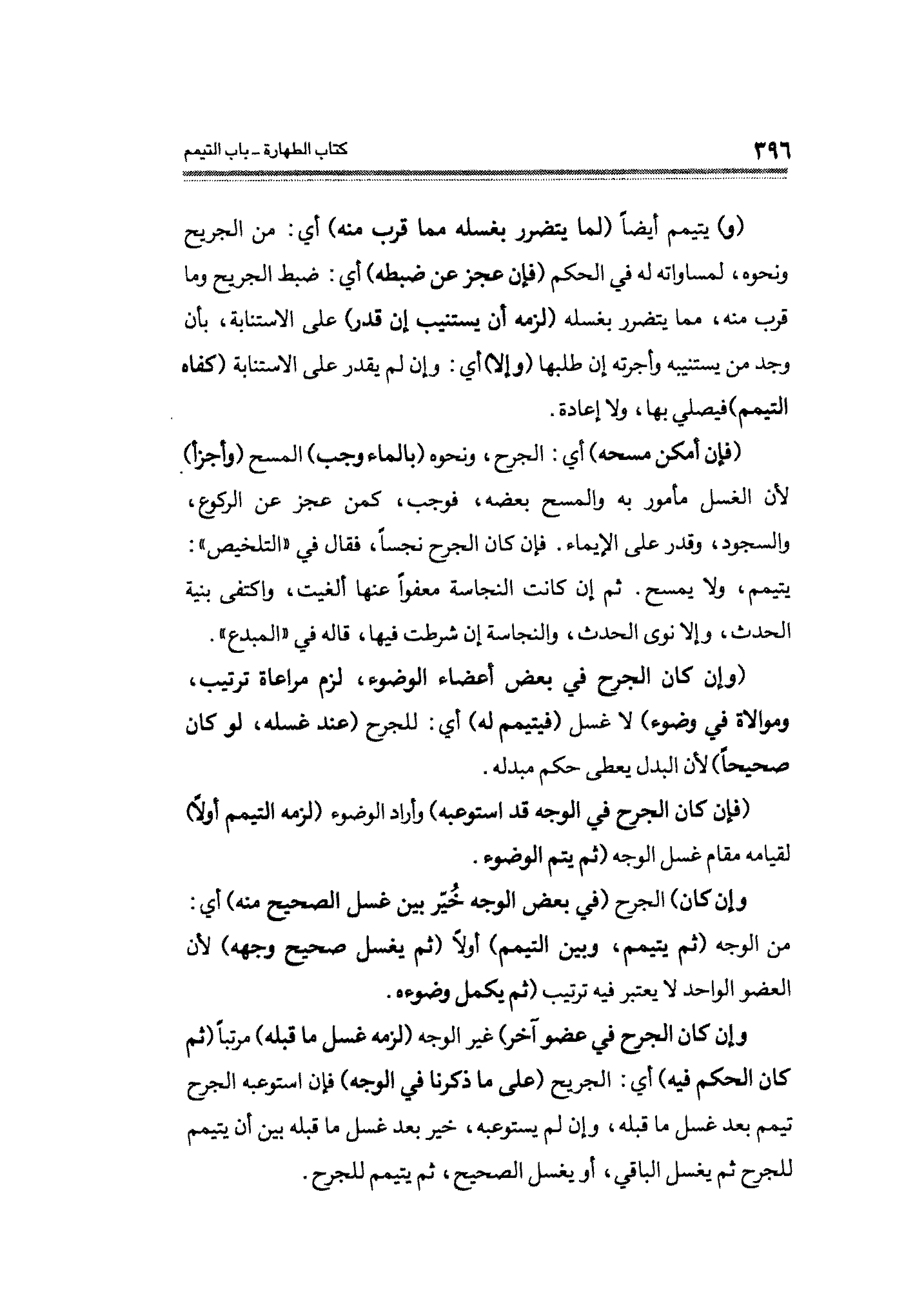 (فإن أمكن مسحه) أي: الجرح، ونحوه (بالماء وجب) المسح (وأجزأ) لأن الغسل مأمور به والمسح بعضه، فوجب، كمن عجز عن الركوع، والسجود، وقدر على الإيماء. فإن كان الجرح نجسًا، فقال في "التلخيص": يتيمم، ولا يمسح. ثم إن كانت النجاسة معفوًا عنها ألغيت، واكتفى بنية الحدث، وإلا نوى الحدث، والنجاسة إن شرطت فيها، قاله في "المبدع".