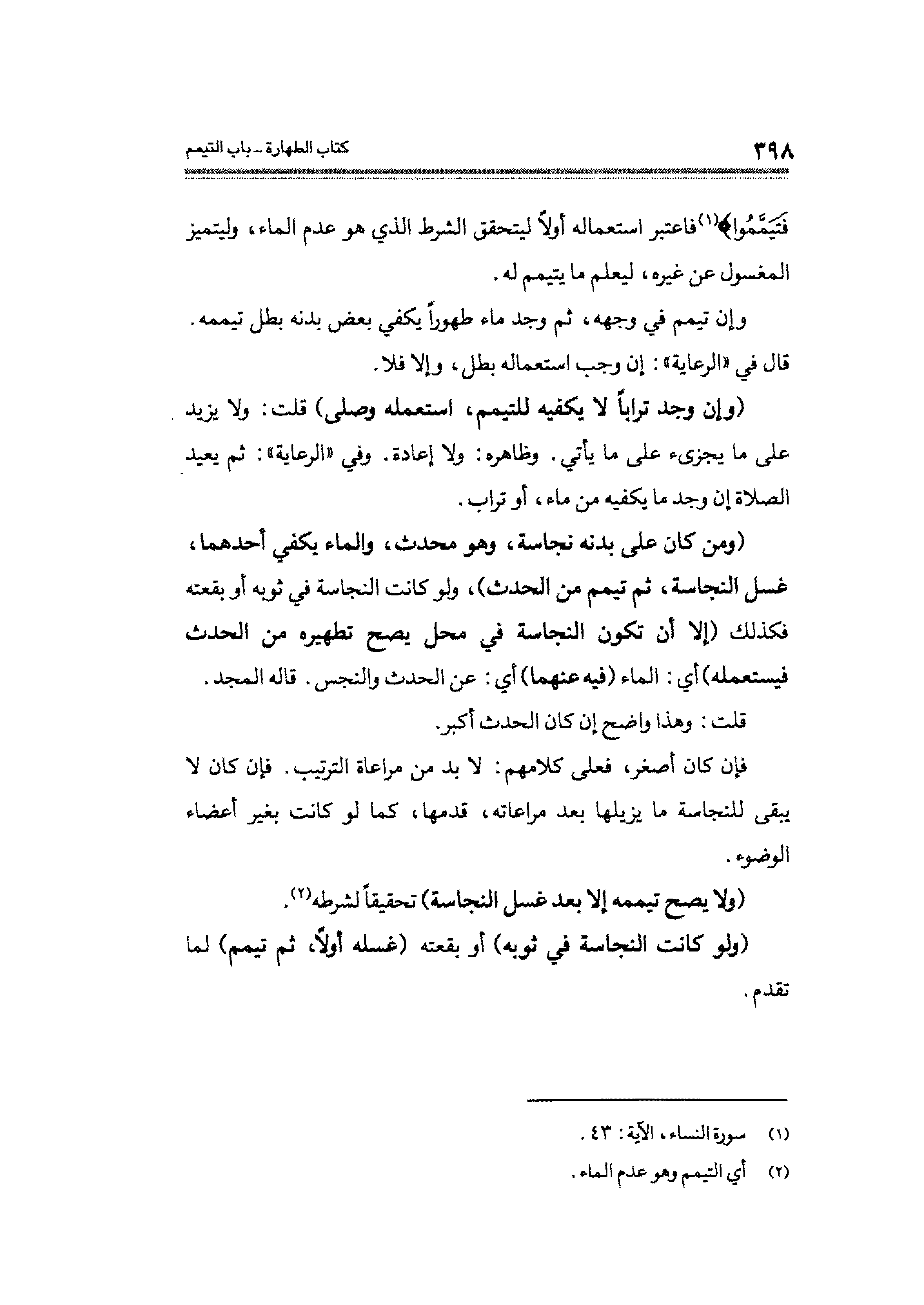 فَتَيَمَّمُوا} (¬١) فاعتبر استعماله أولاً ليتحقق الشرط الذي هو عدم الماء، وليتميز المغسول عن غيره، ليعلم ما يتيمم له.
