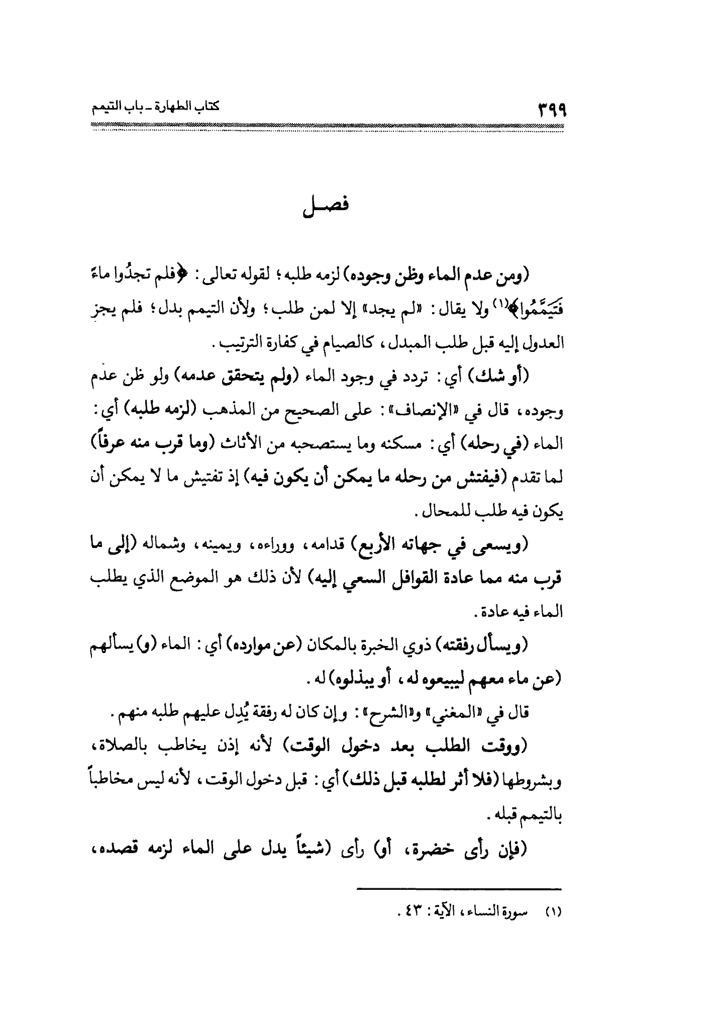 (ومن عدم الماء وظن وجوده) لزمه طلبه؛ لقوله تعالى: {فَلَمْ تَجِدُوا مَاءً فَتَيَمَّمُوا} (¬١) ولا يقال: "لم يجد" إلا لمن طلب؛ ولأن التيمم بدل؛ فلم يجز العدول إليه قبل طلب المبدل، كالصيام في كفارة الترتيب.