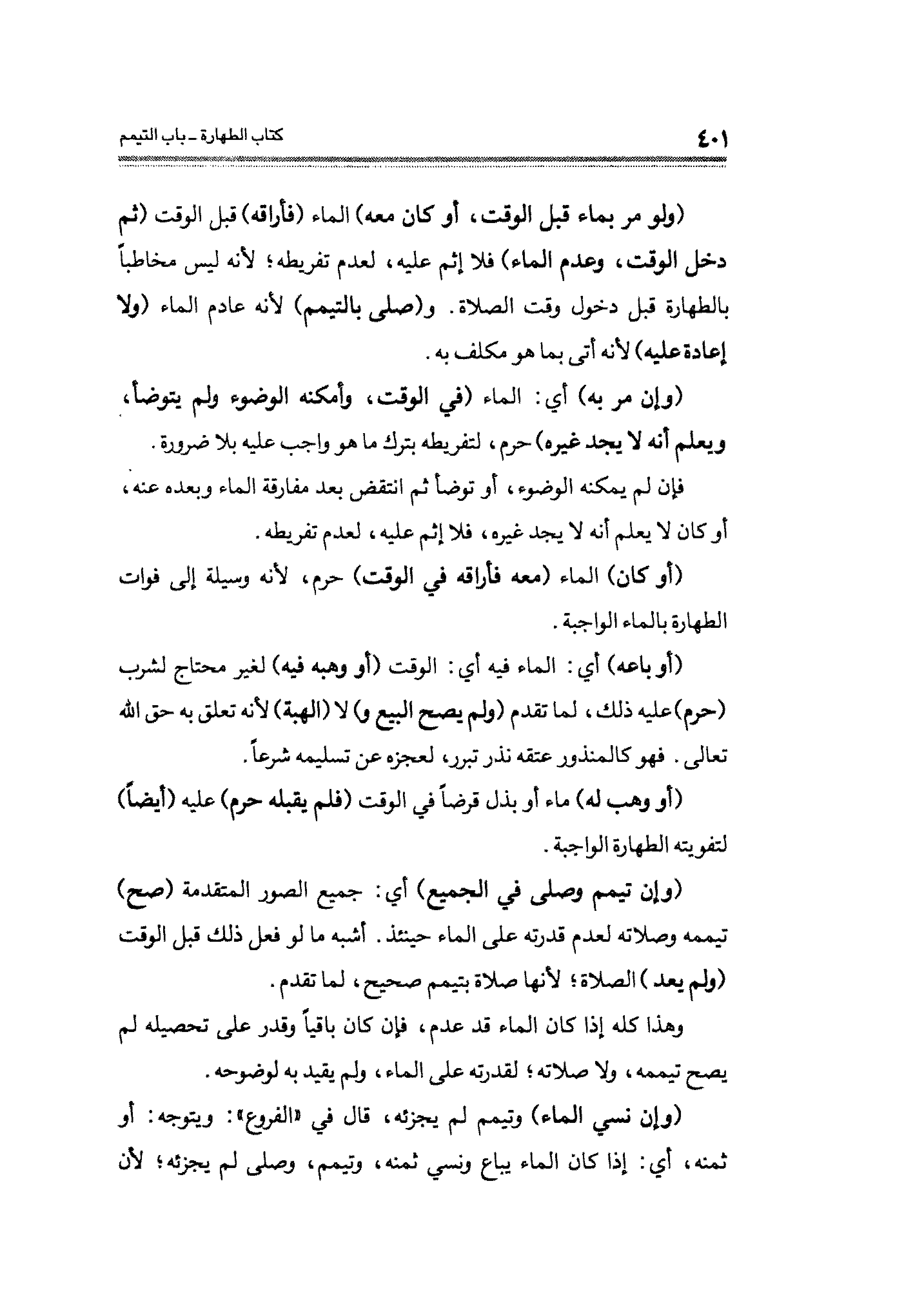 (ولو مر بماء قبل الوقت، أو كان معه) الماء (فأراقه) قبل الوقت (ثم دخل الوقت، وعدم الماء) فلا إثم عليه، لعدم تفريطه؛ لأنه ليس مخاطباً بالطهارة قبل دخول وقت الصلاة. و (صلى بالتيمم) لأنه عادم الماء (ولا إعادة عليه) لأنه أتى بما هو مكلف به.