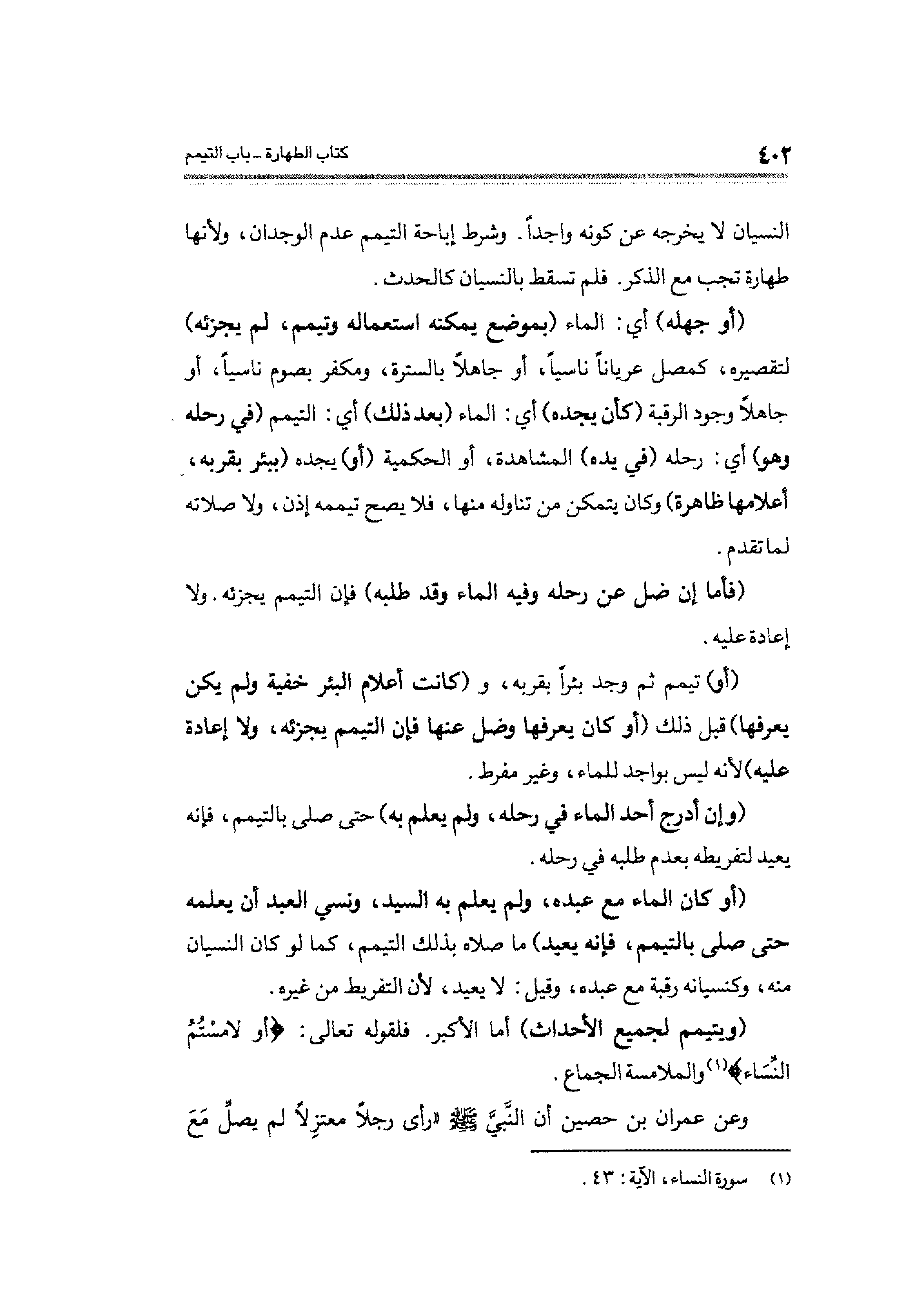 (أو) تيمم ثم وجد بئراً بقربه، و (كانت أعلام البئر خفية ولم يكن يعرفها) قبل ذلك (أو كان يعرفها وضل عنها فإن التيمم يجزئه، ولا إعادة عليه لأنه ليس بواجد للماء، وغير مفرط.