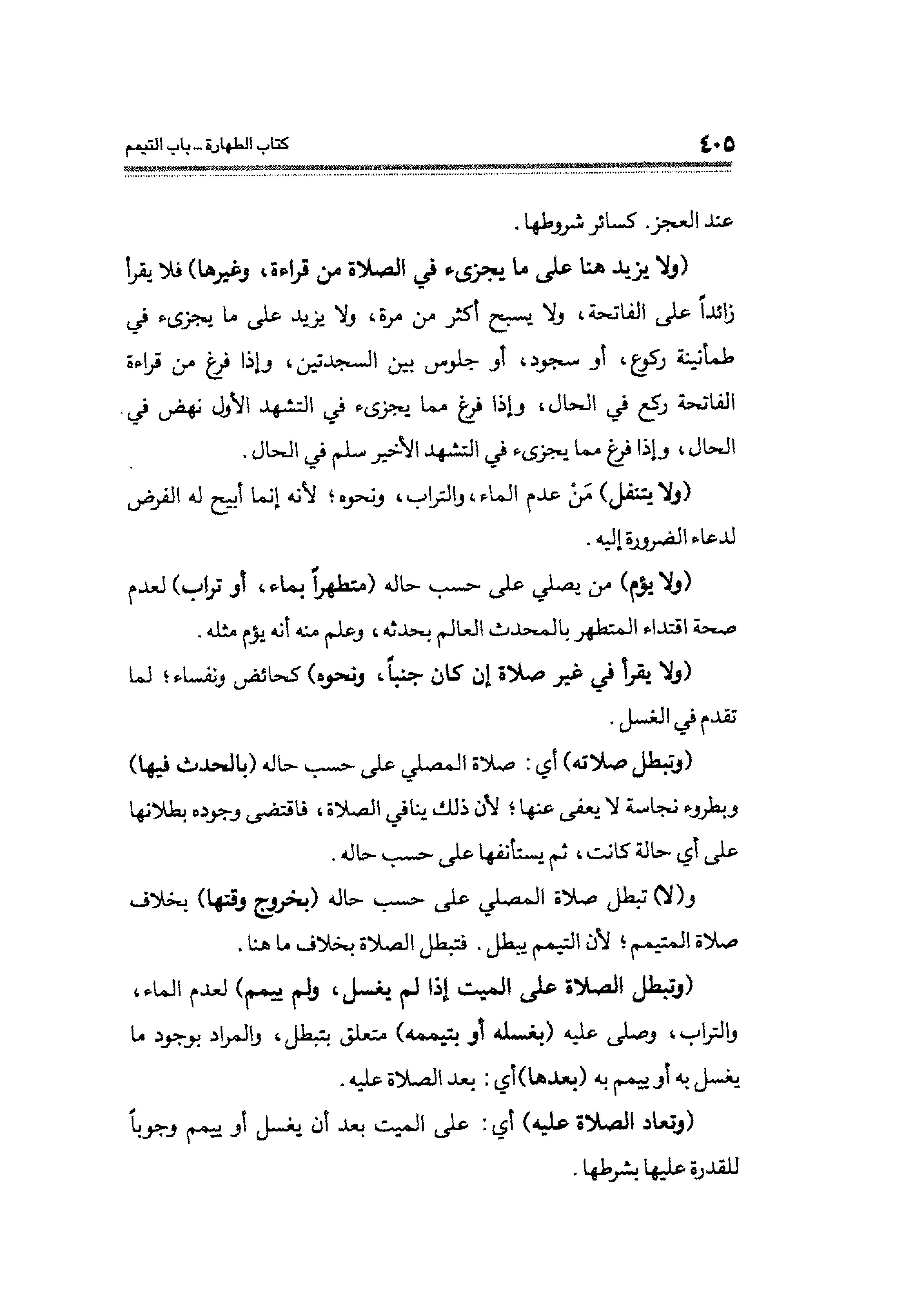 (ولا يؤم) من يصلي على حسب حاله (متطهراً بماء، أو تراب) لعدم صحة اقتداء المتطهر بالمحدث العالم بحدثه، وعلم منه أنه يؤم مثله.