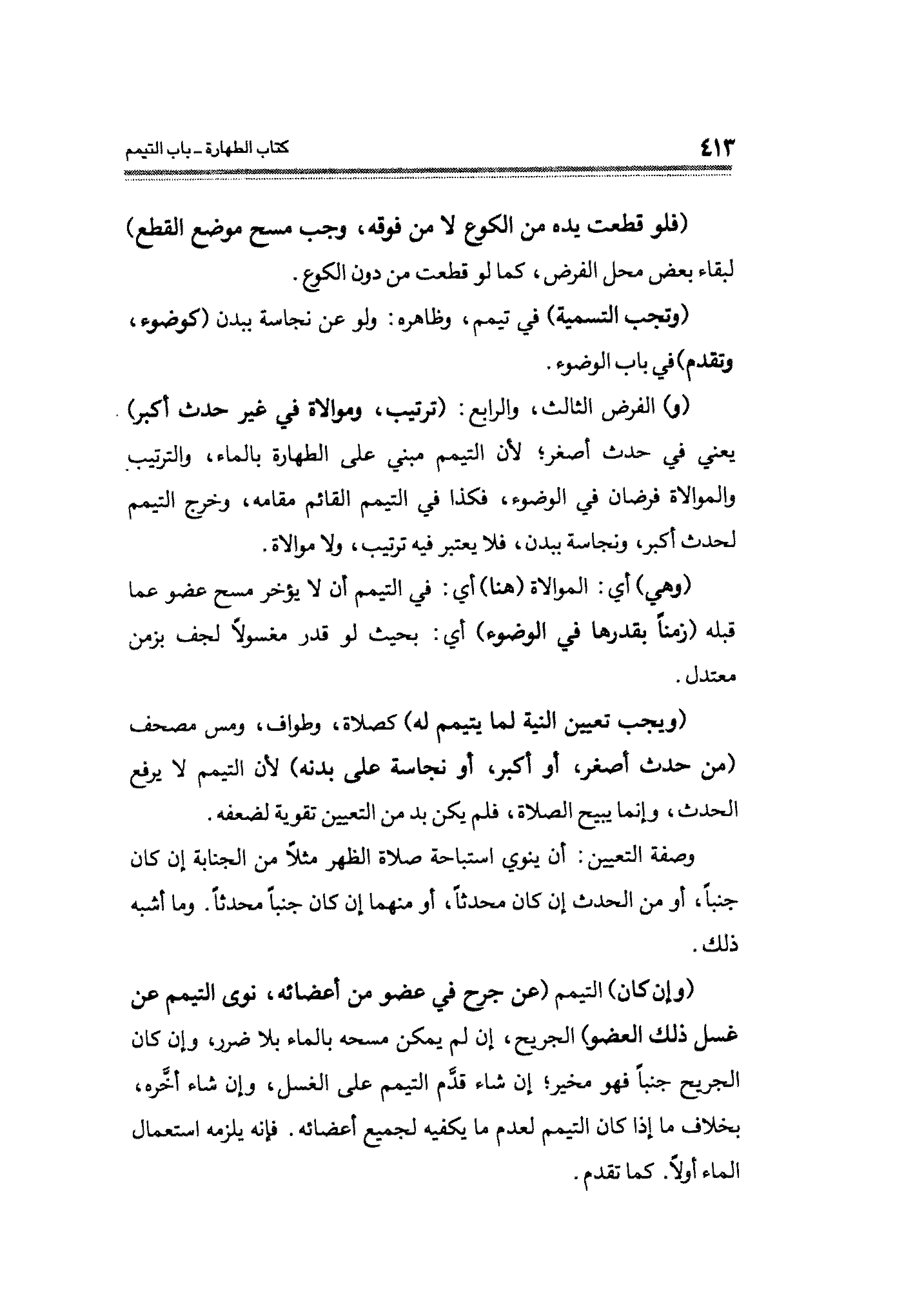 (وهي) أي: الموالاة (هنا) أي: في التيمم أن لا يؤخر مسح عضو عما قبله (زمنًا بقدرها في الوضوء) أي: بحيث لو قدر مغسولاً لجف بزمن معتدل.
