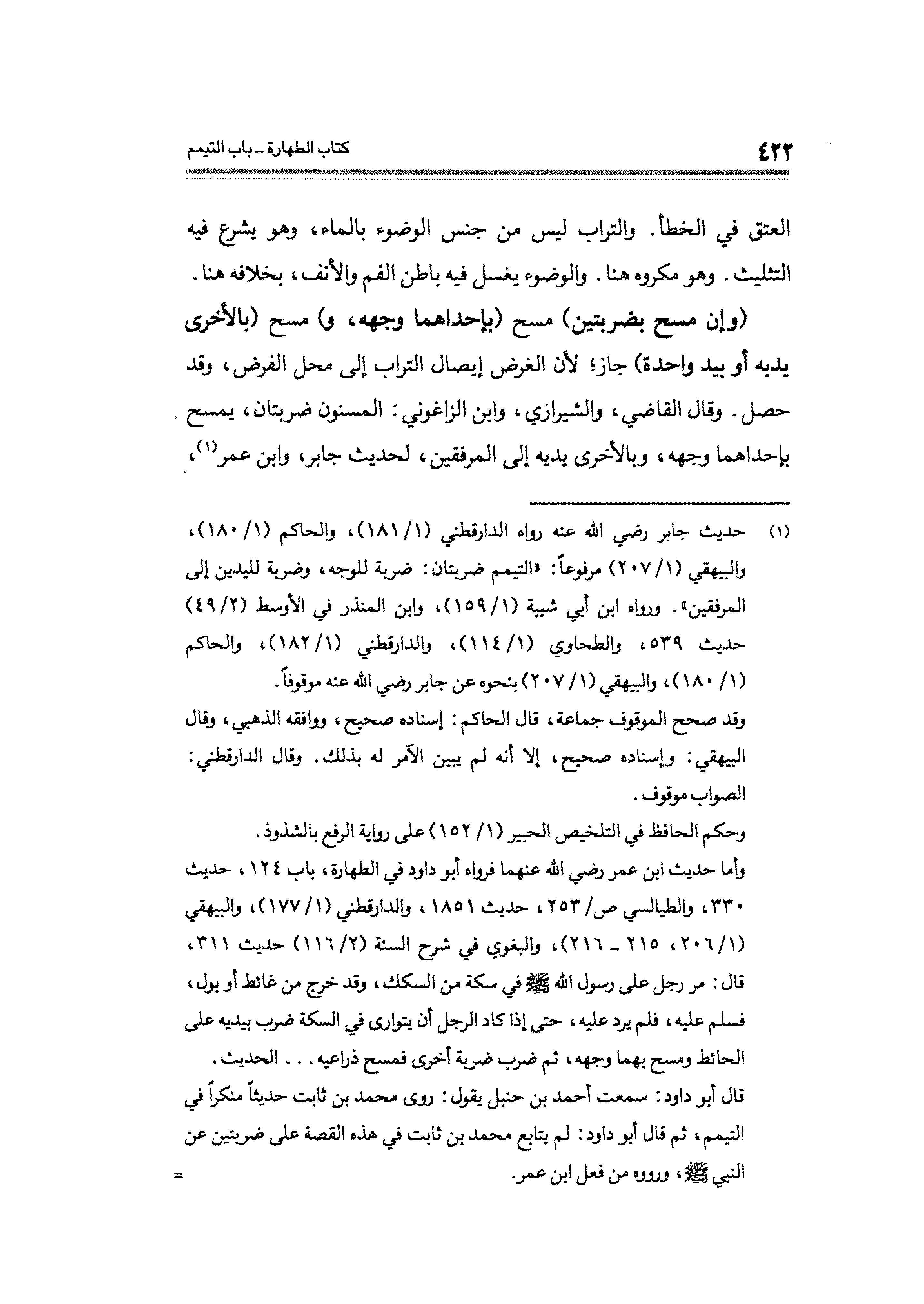 (¬١) حديث جابر رضي الله عنه رواه الدارقطني (١/ ١٨١)، والحاكم (١/ ١٨٠)، والبيهقي (١/ ٢٠٧) مرفوعًا: "التيمم ضربتان: ضربة للوجه، وضربة لليدين إلى المرفقين". ورواه ابن أبي شيبة (١/ ١٥٩)، وابن المنذر في الأوسط (٢/ ٤٩) حديث ٥٣٩، والطحاوي (١/ ١١٤)، والدارقطني (١/ ١٨٢)، والحاكم (١/ ١٨٠)، والبيهقي (١/ ٢٠٧) بنحوه عن جابر رضي الله عنه موقوفًا.