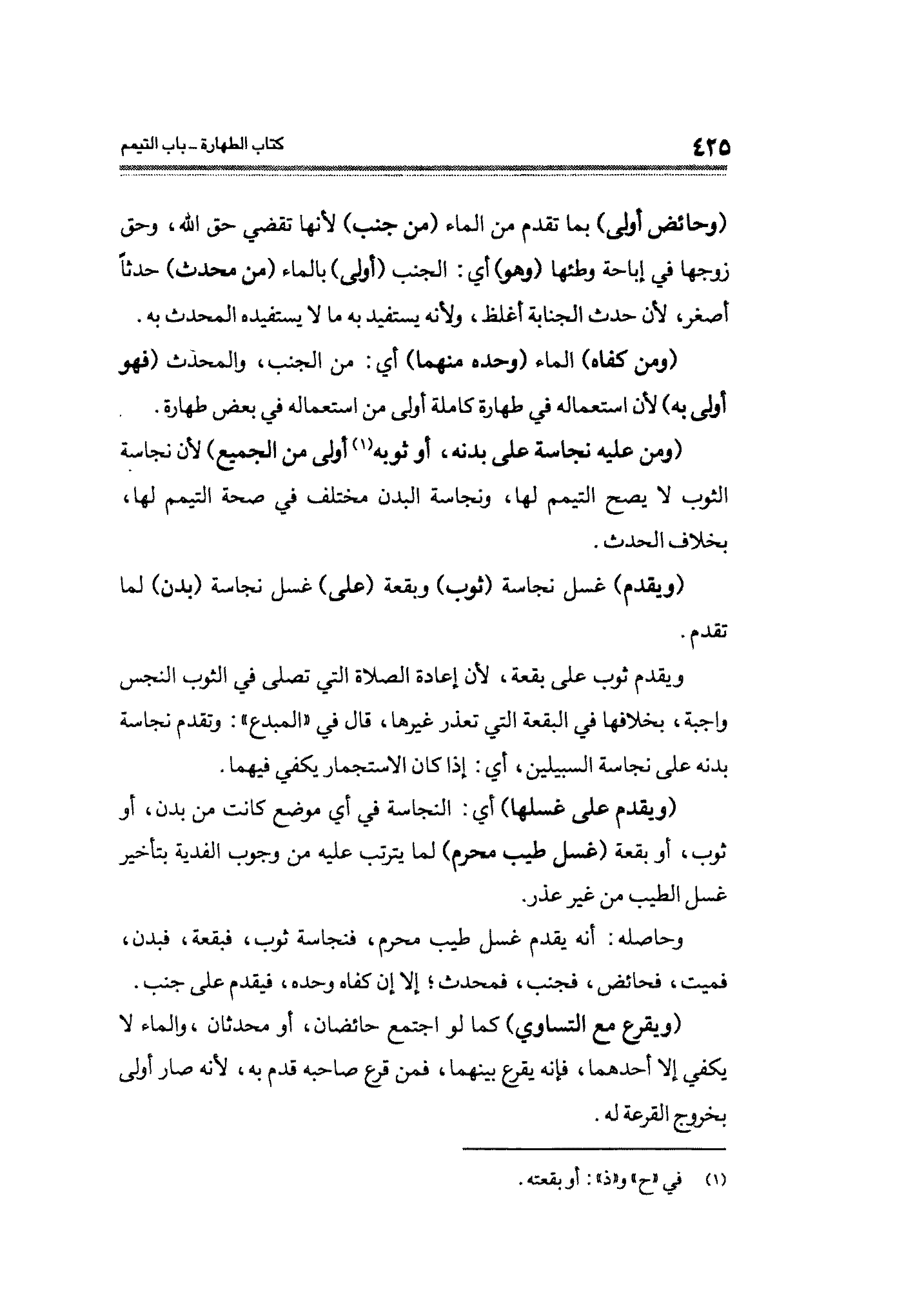 وحاصله: أنه يقدم غسل طيب محرم، فنجاسة ثوب، فبقعة، فبدن، فميت، فحائض، فجنب، فمحدث؛ إلا إن كفاه وحده، فيقدم على جنب.