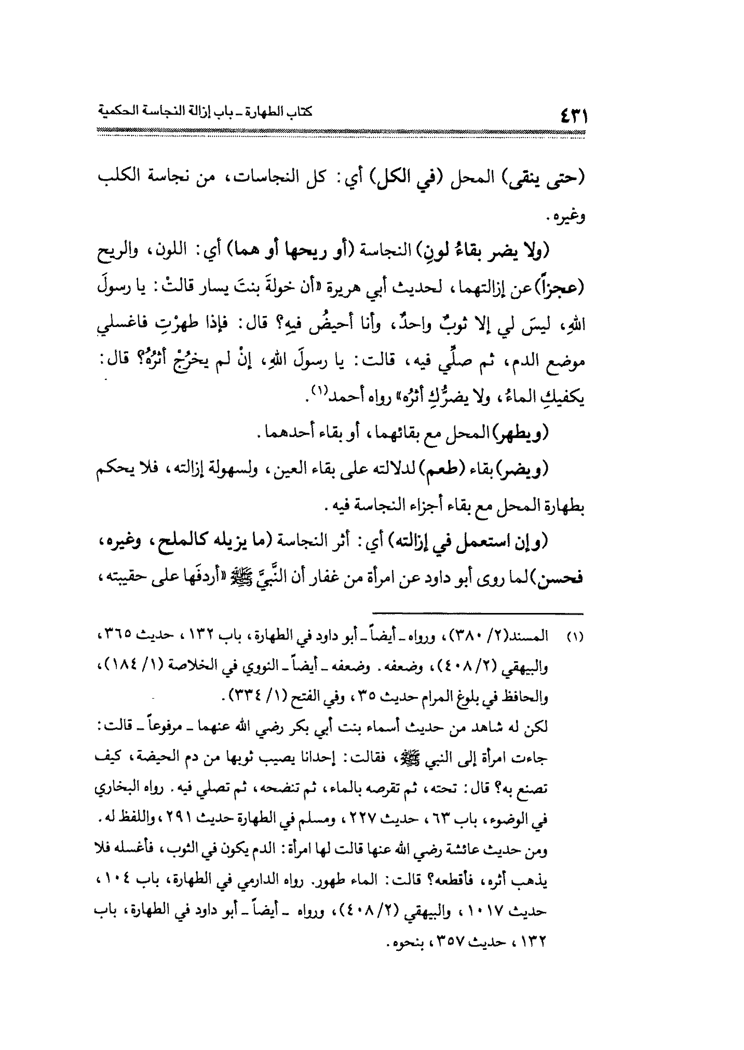 (ولا يضر بقاءُ لونِ) النجاسة (أو ريحها أو هما) أي: اللون، والريح (عجزًا) عن إزالتهما، لحديث أبي هريرة "أن خولةَ بنتَ يسار قالتْ: يا رسولَ اللهِ، ليسَ لي إلا ثوبٌ واحدٌ، وأنا أحيضُ فيهِ؟ قال: فإذا طهرْتِ فاغسلي موضع الدم، ثم صلِّي فيه، قالت: يا رسولَ اللهِ، إنْ لم يخرُجْ أثرُهُ؟ قال: يكفيك الماءُ، ولا يضرُّكِ أثرُه" رواه أحمد (¬١).
