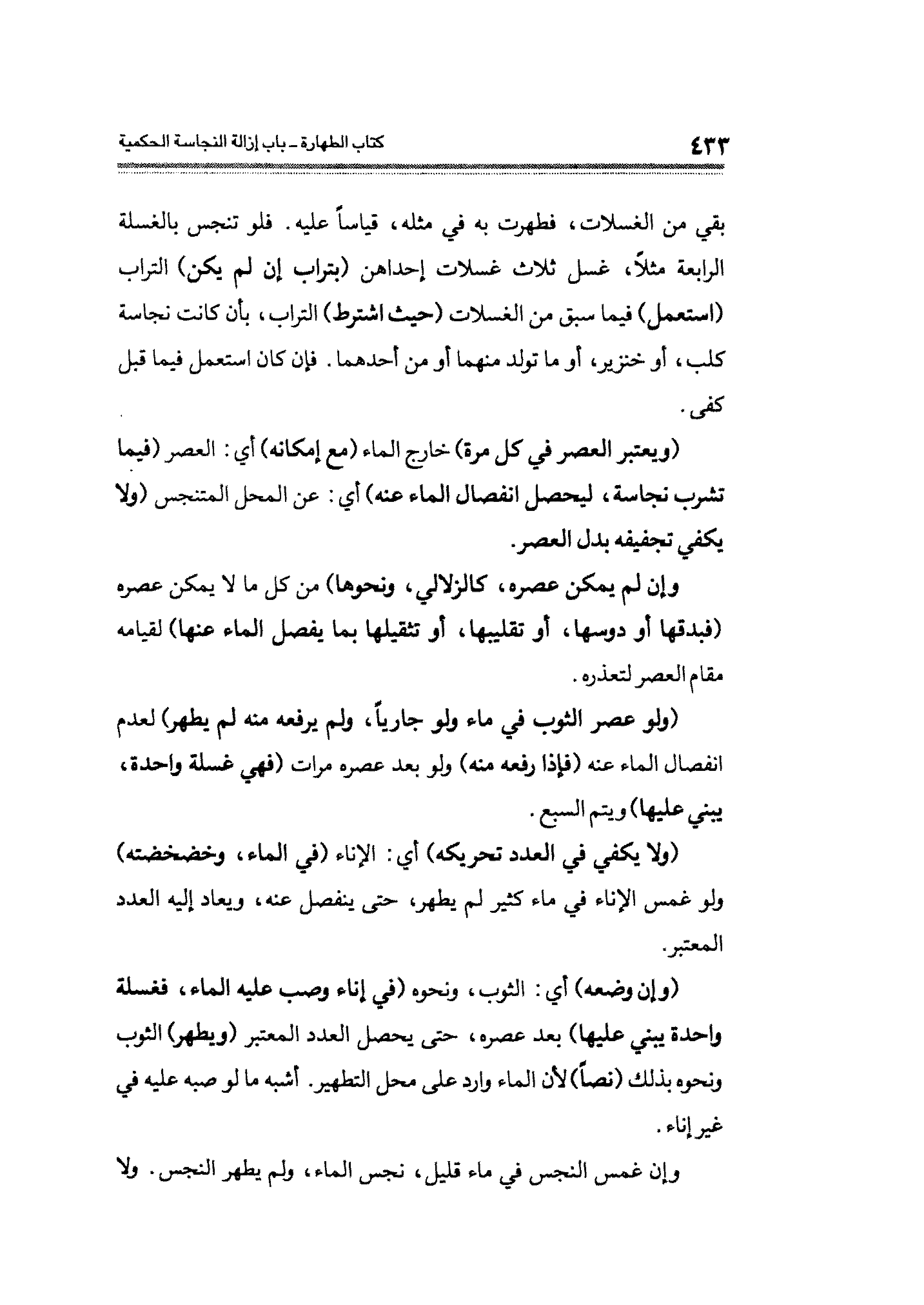 (ويعتبر العصر في كل مرة) خارج في الماء (مع إمكانه) أي: العصر (فيما تشرب نجاسة، ليحصل انفصال الماء عنه) أي: عن المحل المتنجس (ولا يكفي تجفيفه بدل العصر.