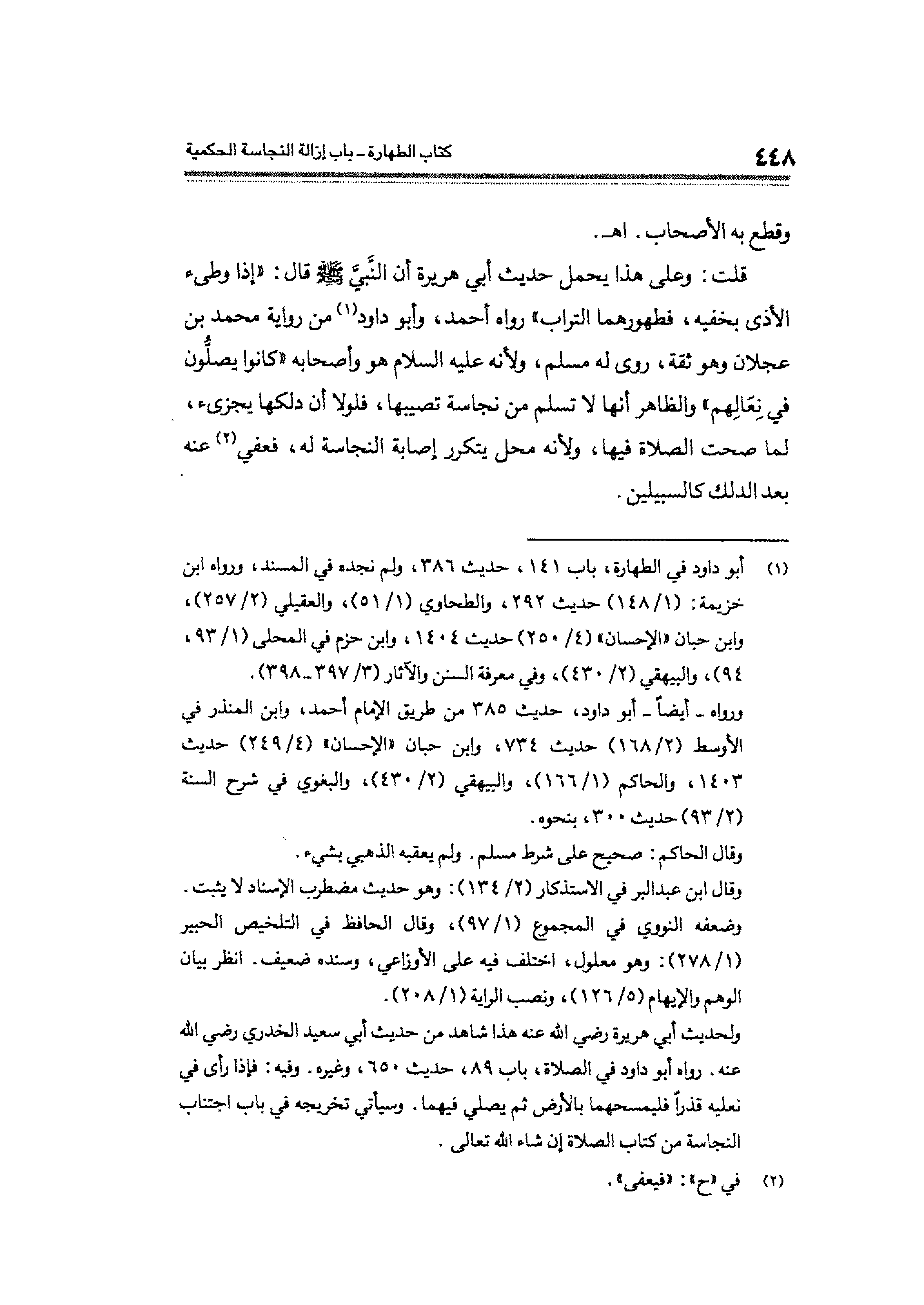 ولحديث أبي هريرة رضي الله عنه هذا شاهد من حديث أبي سعيد الخدري رضي الله عنه. رواه أبو داود في الصلاة، باب ٨٩، حديث ٦٥٠، وغيره. وفيه: فإذا رأى في نعليه قذرًا فيمسحهما بالأرض ثم يصلي فيهما. وسيأتي تخريجه في باب اجتناب النجاسة من كتاب الصلاة إن شاء الله تعالى.