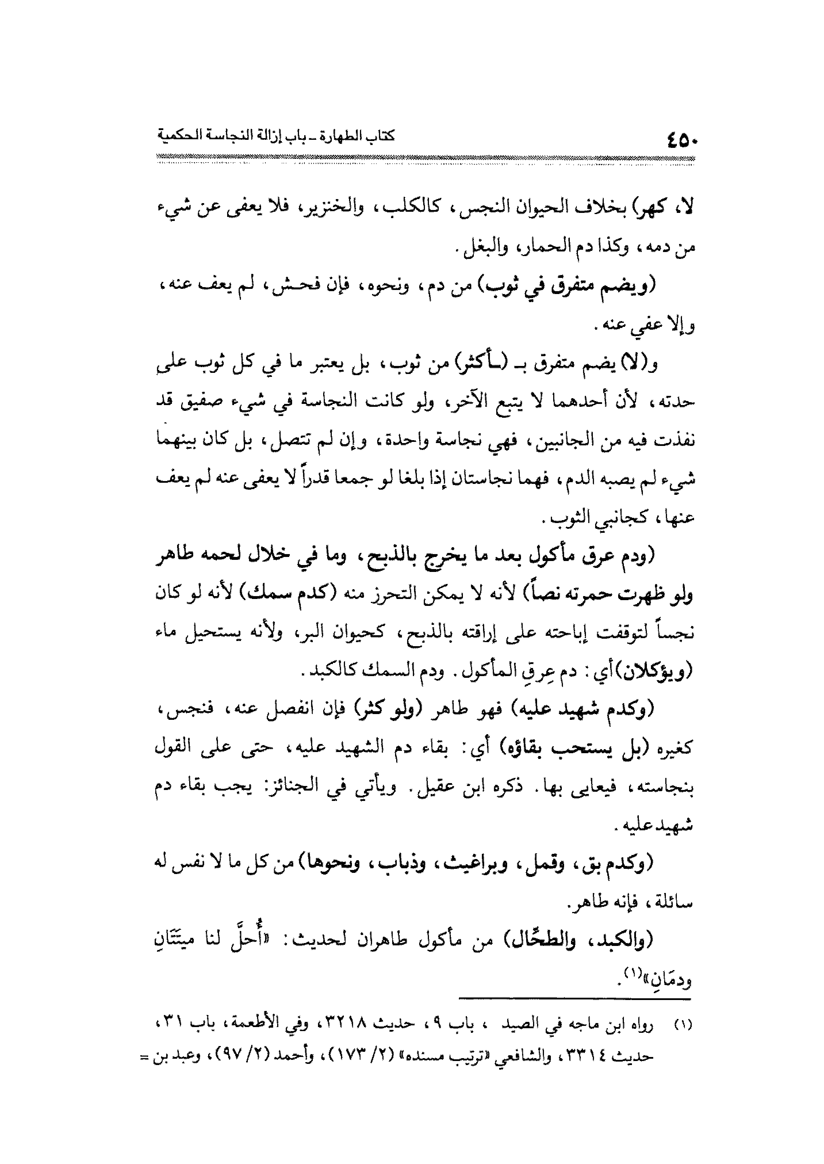 (وكدم شهيد عليه) فهو طاهر (ولو كثر) فإن انفصل عنه، فنجس، كغيره (بل يستحب بقاؤه) أي: بقاء دم الشهيد عليه، حتى على القول بنجاسته، فيعابى بها. ذكره ابن عقيل. ويأتي في الجنائز: يجب بقاء دم شهيد عليه.