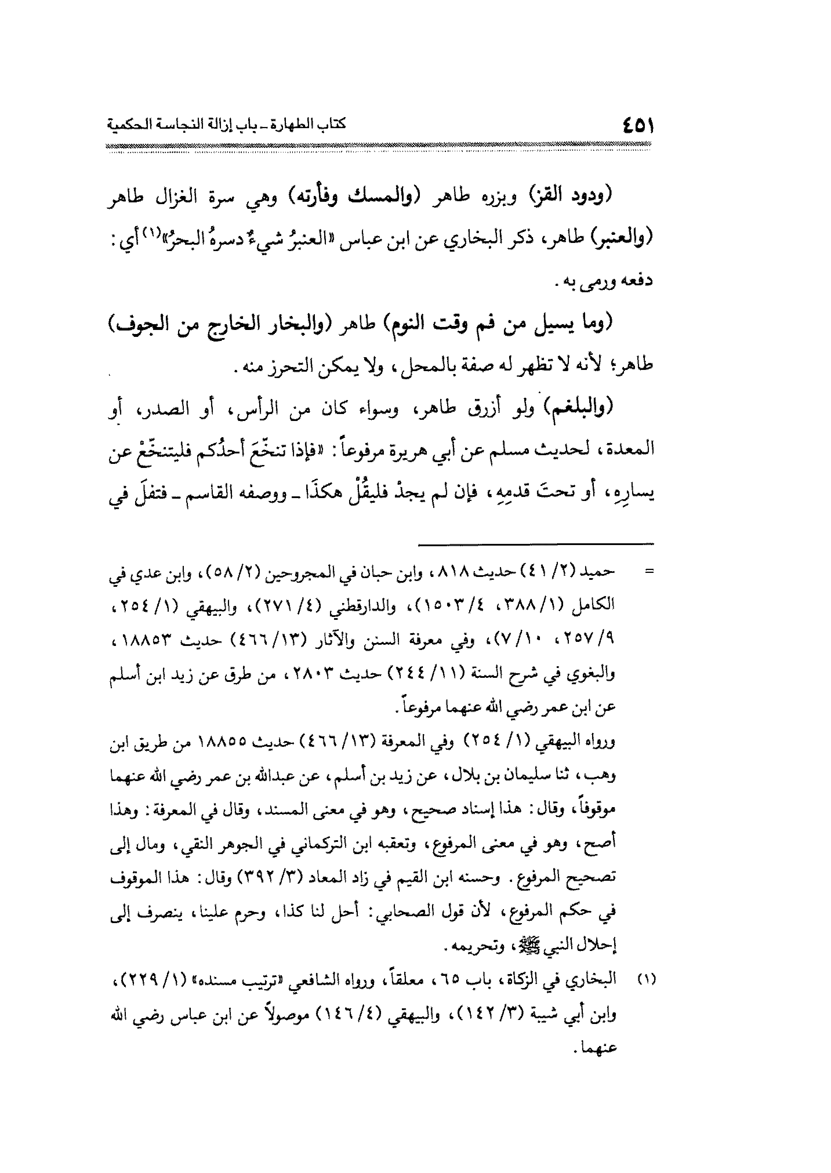 (ودود القز) وبزره طاهر (والمسك وفأرته) وهي سرة الغزال طاهر (والعنبر) طاهر، ذكر البخاري عن ابن عباس "العنبرُ شيءٌ دسرهُ البحرُ" (¬١) أي: دفعه لرمى به.