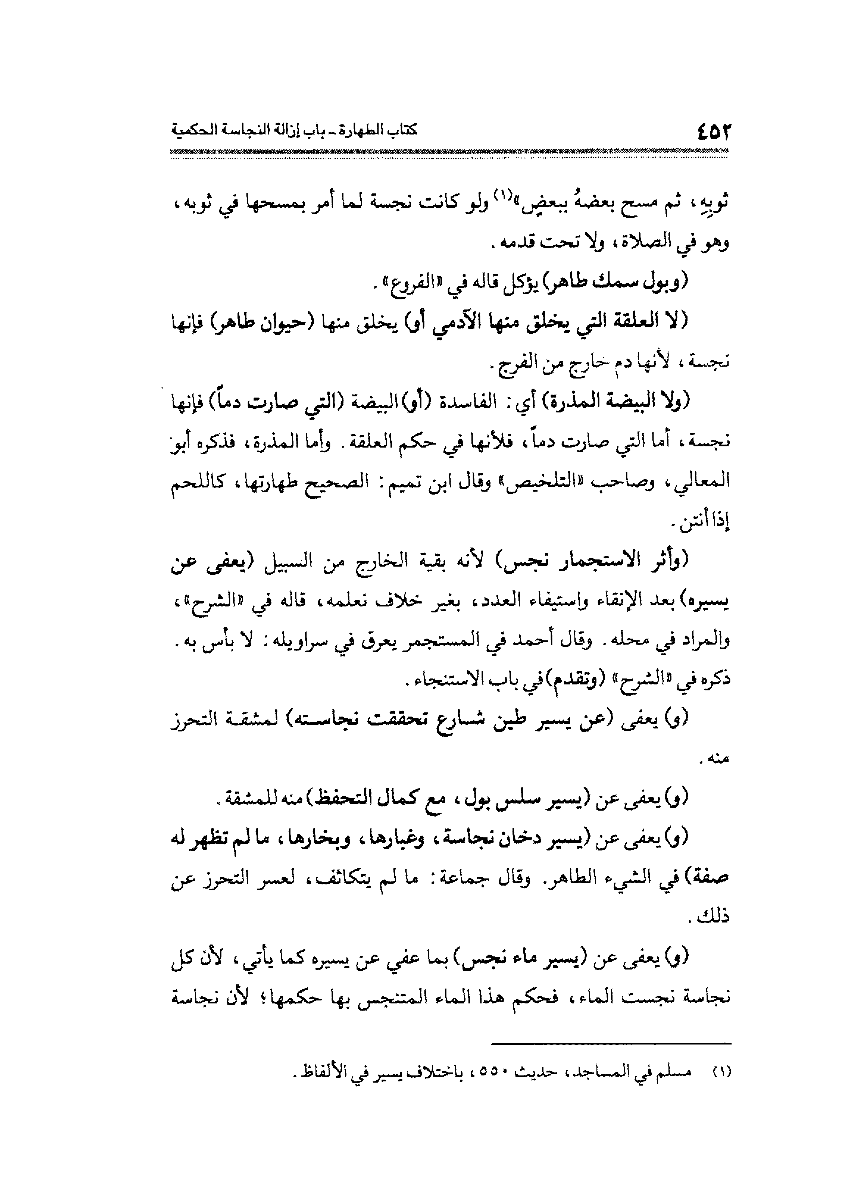 ثوبِهِ، ثم مسح بعضهُ ببعضٍ" (¬١) ولو كانت نجسة لما أمر بمسحها في ثوبه، وهو في الصلاة، ولا تحت قدمه.