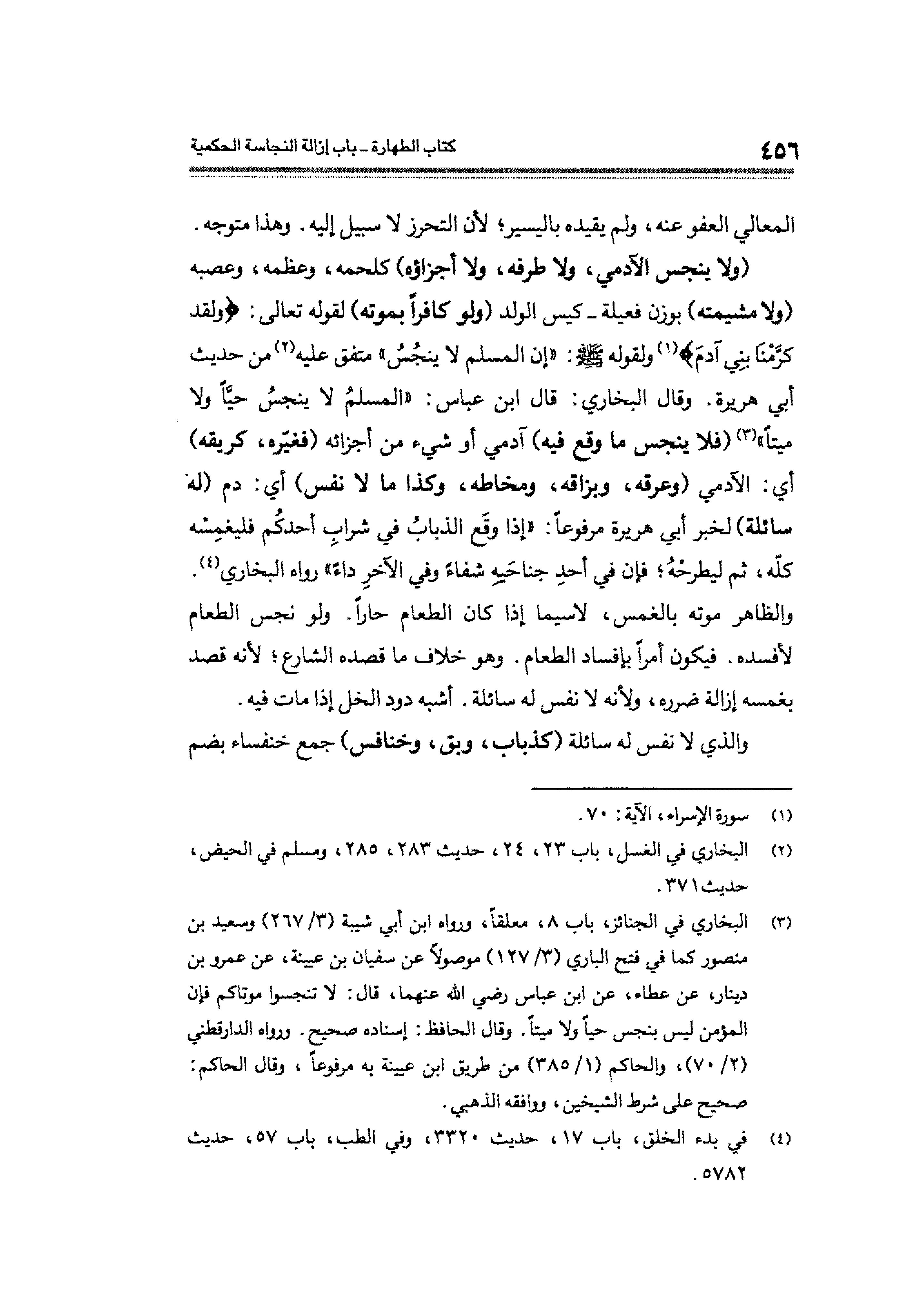 (¬٣) البخاري في الجنائز، باب ٨، معلقًا، ورواه ابن أبي شيبة (٣/ ٢٦٧) وسعيد بن منصور كما في فتح الباري (٣/ ١٢٧) موصولًا عن سفيان بن عيينة، عن عمرو بن دينار، عن عطاء، عن ابن عباس رضي الله عنهما، قال: لا تنجسوا موتكم فإن المؤمن ليس بنجس حيًا ولا ميتًا. وقال الحافظ: إسناده صحيح. ورواه الدارقطني (٢/ ٧٠)، والحاكم (١/ ٣٨٥) من طريق ابن عيينة به مرفوعًا، وقال الحاكم: صحيح على شرط الشيخين، ووافقه الذهبي.