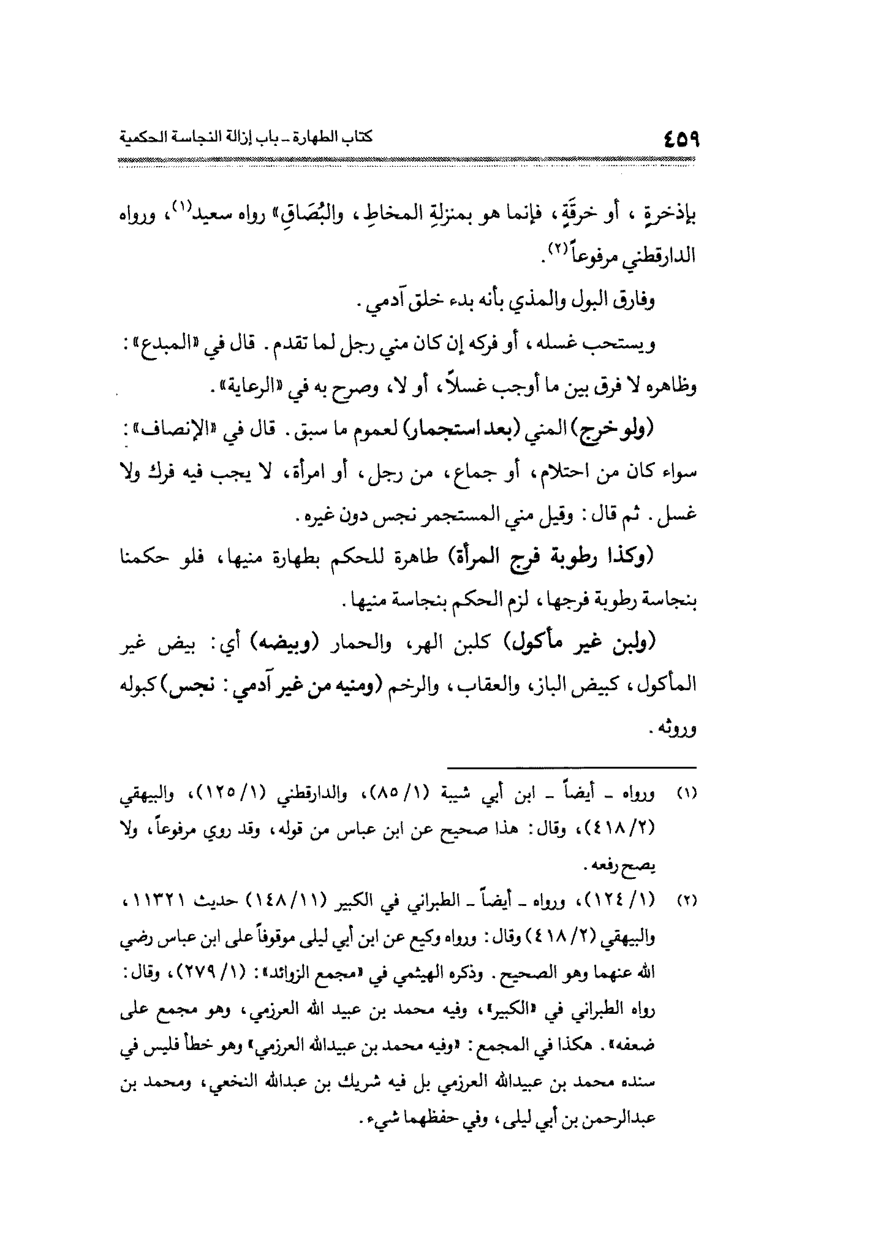 (ولبن غير مأكول) كلبن الهر، والحمار (وبيضه) أي: بيض غير المأكول، كبيض الباز، والعقاب، والرخم (ومنيه من غير آدمى: نجس) كبوله وروثه.