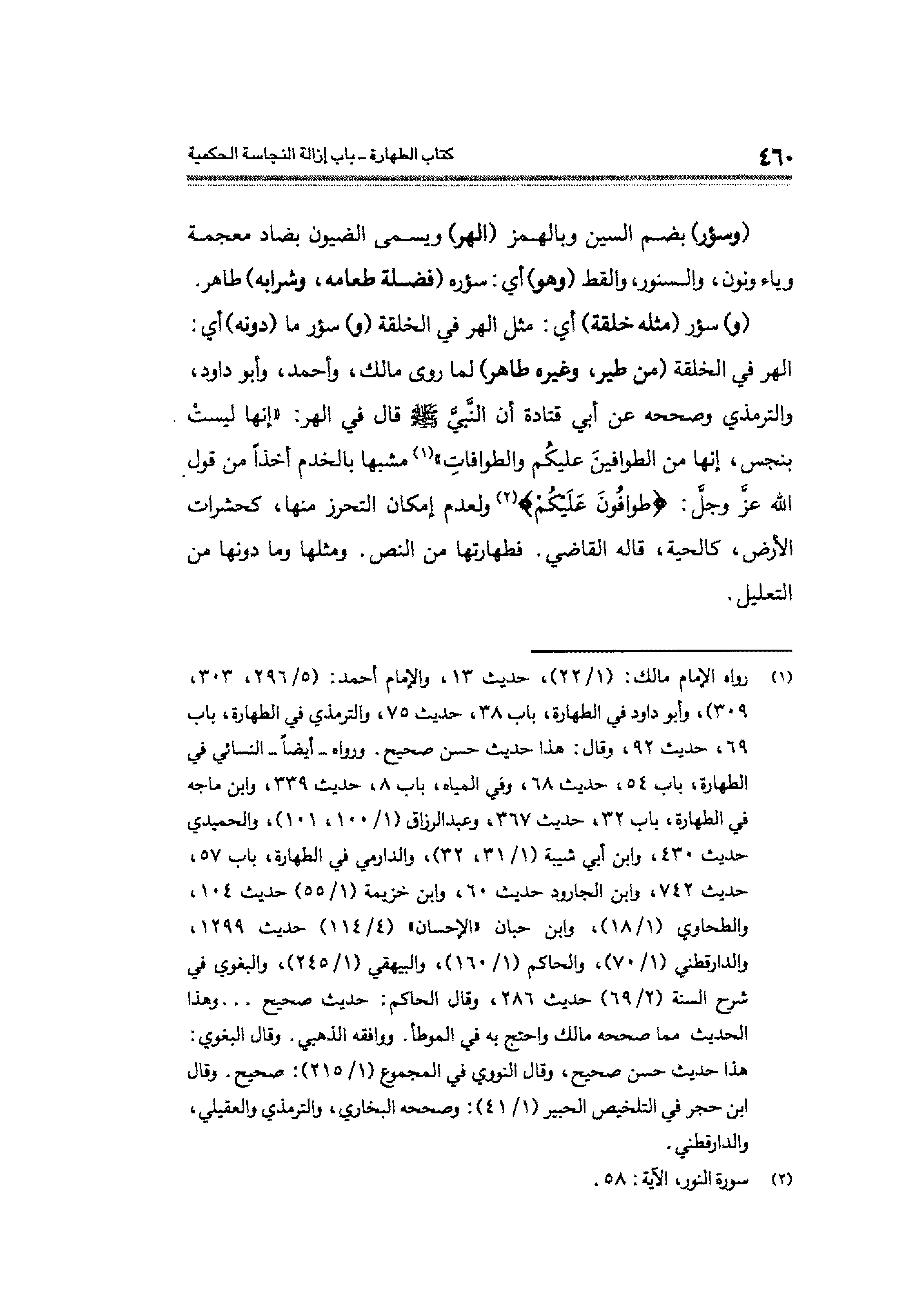 (و) سؤر (مثله خلقة) أي: مثل الهر في الخلقة (و) سؤر ما (دونه) أي: الهر في الخلقة (من طير، وغيره طاهر) لما روى مالك، وأحمد، وأبو داود، والترمذي وصححه عن أبي قتادة أن النَّبيَّ - صلى الله عليه وسلم - قال في الهر: "إنها ليست بنجس، إنها من الطوافينَ عليكُم والطوافاتِ" (¬١) مشبها بالخدم أخذًا من قول الله عزَّ وجلَّ: {طَوَّافُونَ عَلَيْكُمْ} (¬٢) ولعدم إمكان التحرز منها، كحشرات الأرض، كالحية، قاله القاضي. فطهارتها من النص. ومثلها وما دونها من التعليل.