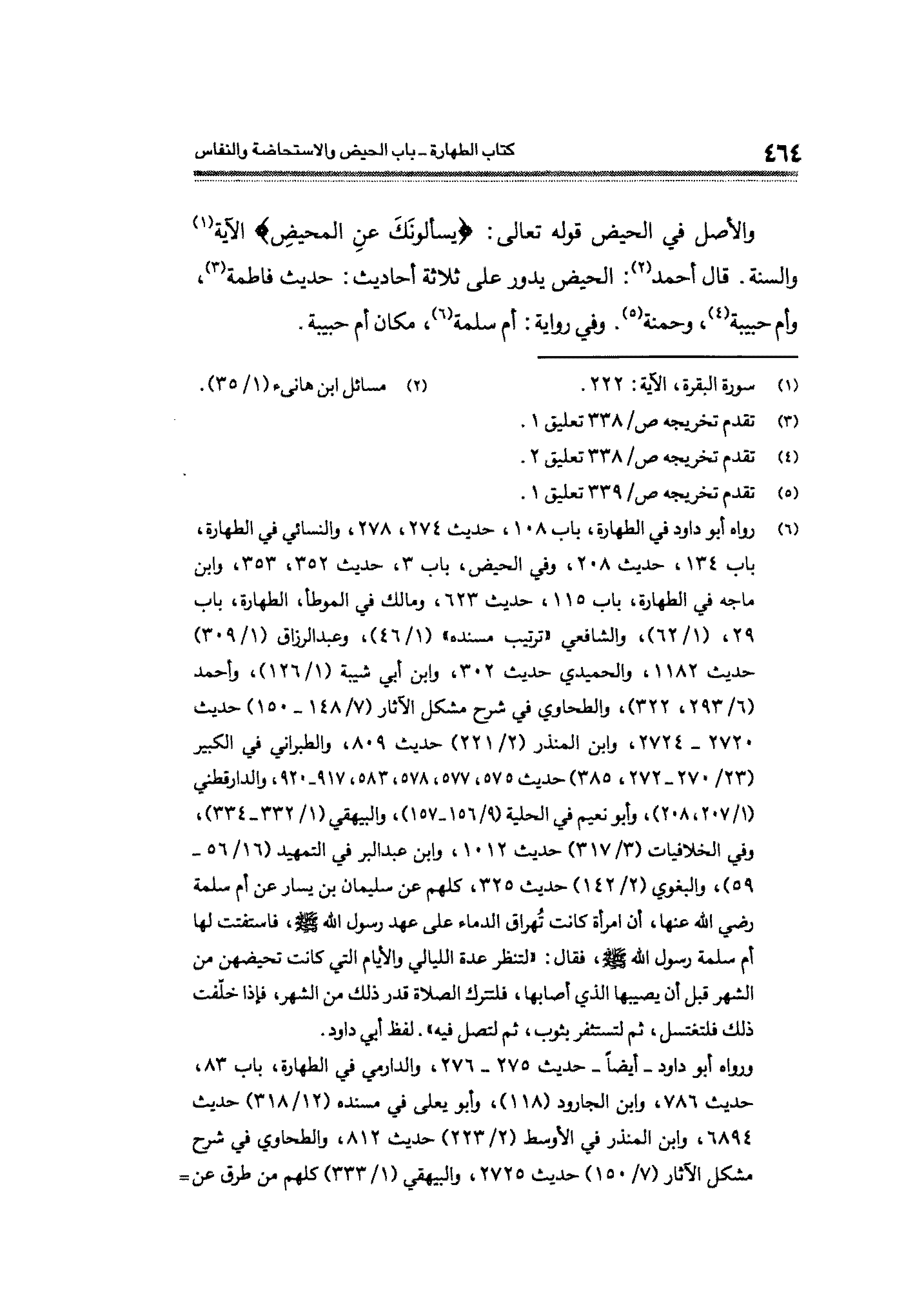 (¬٦) رواه أبو داود في الطهارة، باب ١٠٨، حديث ٢٧٤، ٢٧٨، والثاني في الطهارة، باب ١٣٤، حديث ٢٠٨، وفي الحيض، باب ٣، حديث ٣٥٢، ٣٥٣، وابن ماجه في الطهارة، باب ١١٥، حديث ٦٢٣، ومالك في الموطأ، الطهارة، باب ٢٩، (١/ ٦٢)، والشافعي "ترتيب مسنده" (١/ ٤٦)، وعبد الرزاق (١/ ٣٠٩) حديث ١١٨٢، والحميدي حديث ٣٠٢، وابن أبي شيبة (١/ ١٢٦)، وأحمد (٦/ ٢٩٣، ٣٢٢)، والطحاوي في شرح مشكل الآثار (٧/ ١٤٨ - ١٥٠) حديث ٢٧٢٠ - ٢٧٢٤، وابن المنذر (٢/ ٢٢١) حديث ٨٠٩، والطبراني في الكبير (٢٣/ ٢٧٠ - ٢٧٢، ٣٨٥) حديث ٥٧٥، ٥٧٧، ٥٧٨، ٥٨٣، ٩١٧ - ٩٢٠، والدارقطني (١/ ٢٠٧، ٢٠٨)، وأبو نعيم في الحلية (٩/ ١٥٦ - ١٥٧)، والبيهقي (١/ ٣٣٢ - ٣٣٤)، وفي الخلافيات (٣/ ٣١٧) حديث ١٠١٢، وابن عبد البر في التمهيد (١٦/ ٥٦ - ٥٩)، والبغوي (٢/ ١٤٢) حديث ٣٢٥، كلهم عن سليمان بن يسار عن أم سلمة رضي الله عنها، أن امرأة كانت تُهراق الدماء على عهد رسول الله - صلى الله عليه وسلم -، فاستفتت لها أم سلمة رسول الله - صلى الله عليه وسلم -، فقال: "لتنظر عدة الليالي والأيام التي كانت تحيضهن من الشهر قبل أن يصيبها الذي أصابها، فلتترك الصلاة قدر ذلك من الشهر، فإذا خلّفت ذلك فلتغتسل، ثم لتستثفر ثوب، ثم تصل فيه". لفظ أبي داود.