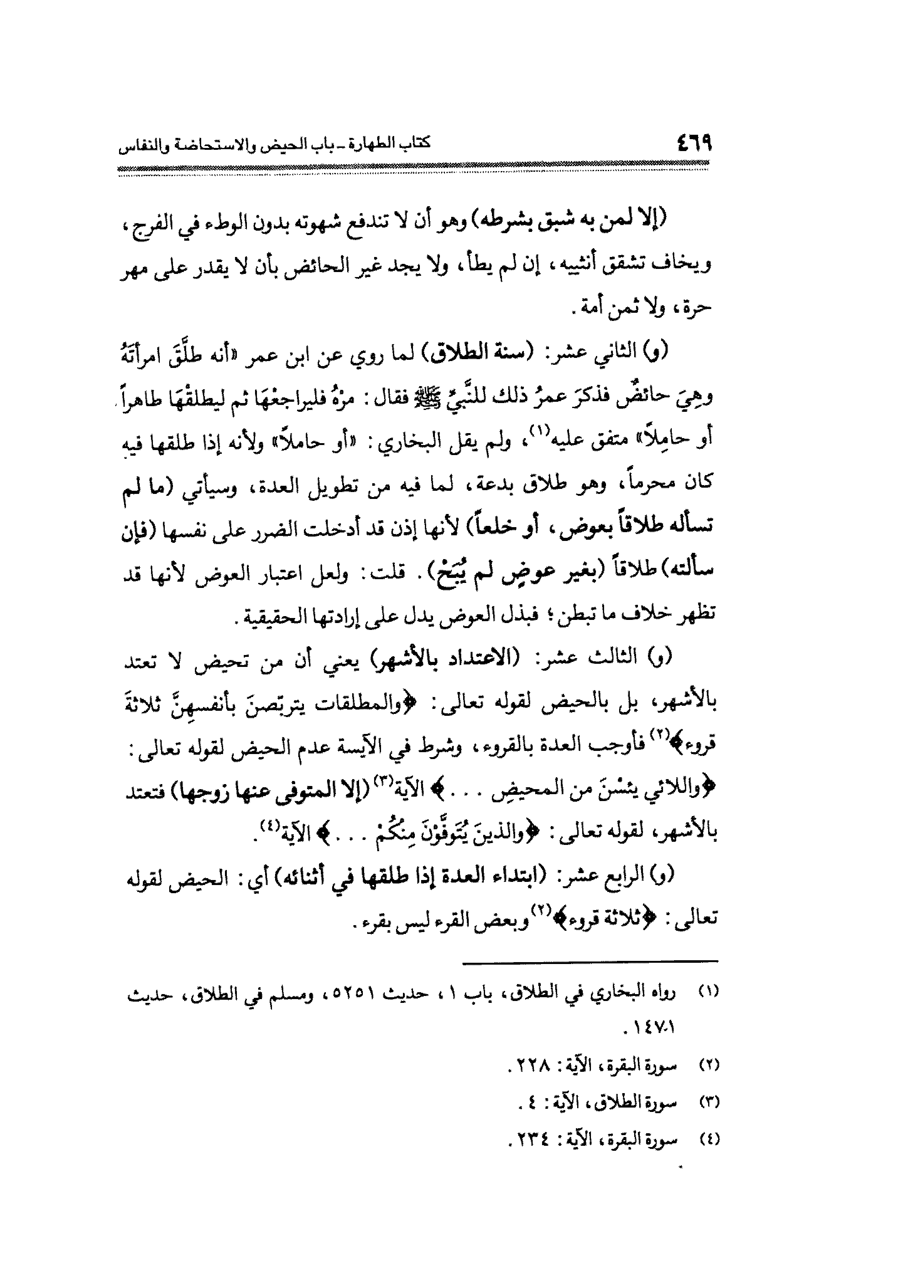 (و) الثاني عشر: (سنة الطلاق) لما روي عن ابن عمر "أنه طلَّقَ امرأتَهُ وهِيَ حائضٌ فذكرَ عمرُ ذلك للنَّبيِّ - صلى الله عليه وسلم - فقال: مرةُ فليراجعْهَا ثم ليطلقْهَا طاهرًا أو حامِلًا" متفق عليه (¬١)، ولم يقل البخاري: "أو حاملًا" ولأنه إذا طلقها فيه كان محرمًا، وهو طلاق بدعة، لما فيه من تطويل العدة، وسيأتي (ما لم تسأله طلاقًا بعوض، أو خلعًا) لأنها إذن قد أدخلت الضرر على نفسها (فإن سألته) طلاقًا (بغير عوضٍ لم يُبَحْ). قلت: ولعل اعتبار العوض لأنها فد تظهر خلاف ما تبطن، فبذل العوض يدل على إرادتها الحقيقية.