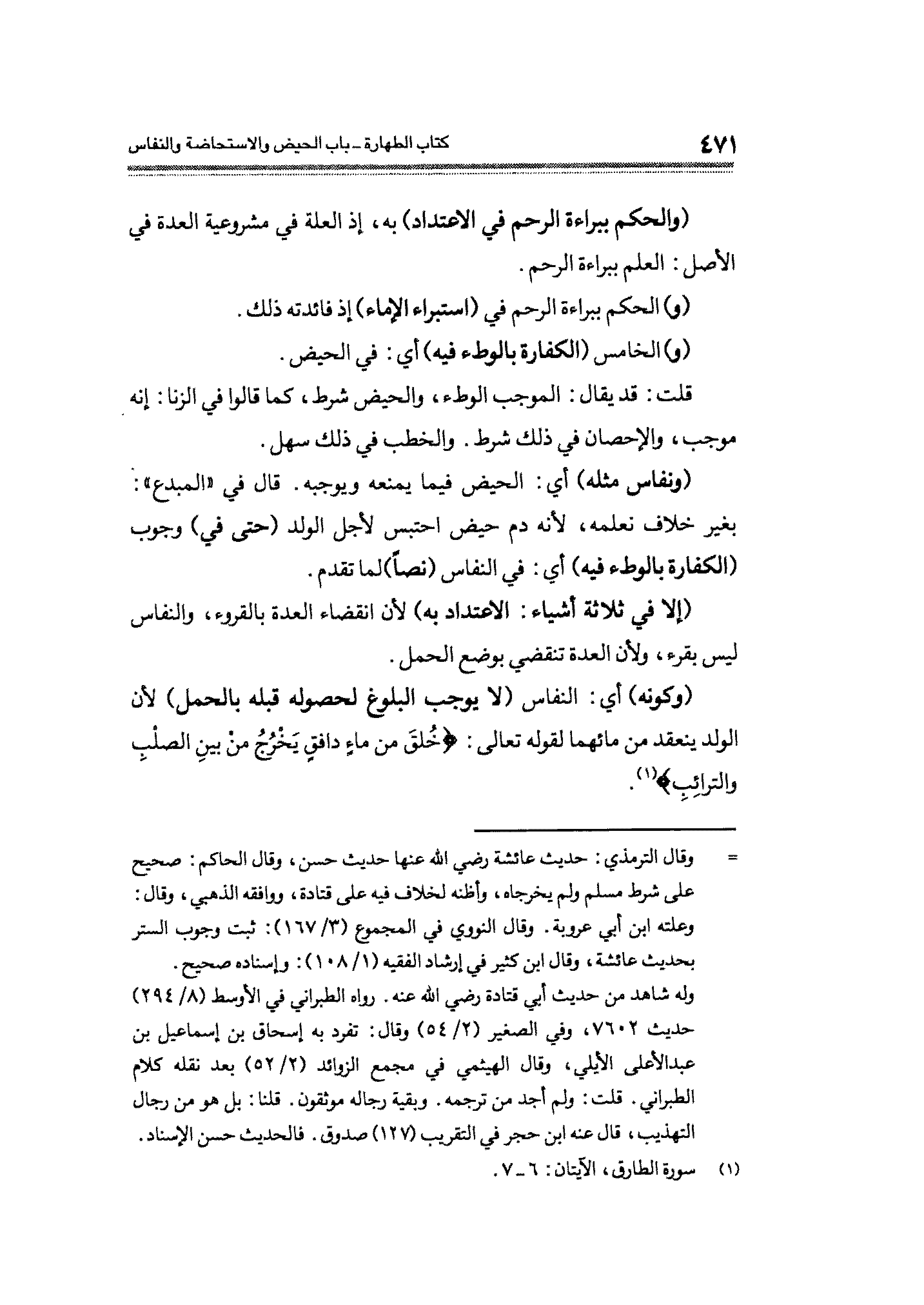 (وكونه) أي: النفاس (لا يوجب البلوغ لحصوله قبله بالحمل) لأن الولد ينعقد من مائهما لقوله تعالى: {خُلِقَ مِنْ مَاءٍ دَافِقٍ (٦) يَخْرُجُ مِنْ بَيْنِ الصُّلْبِ وَالتَّرَائِبِ (٧)} (¬١).