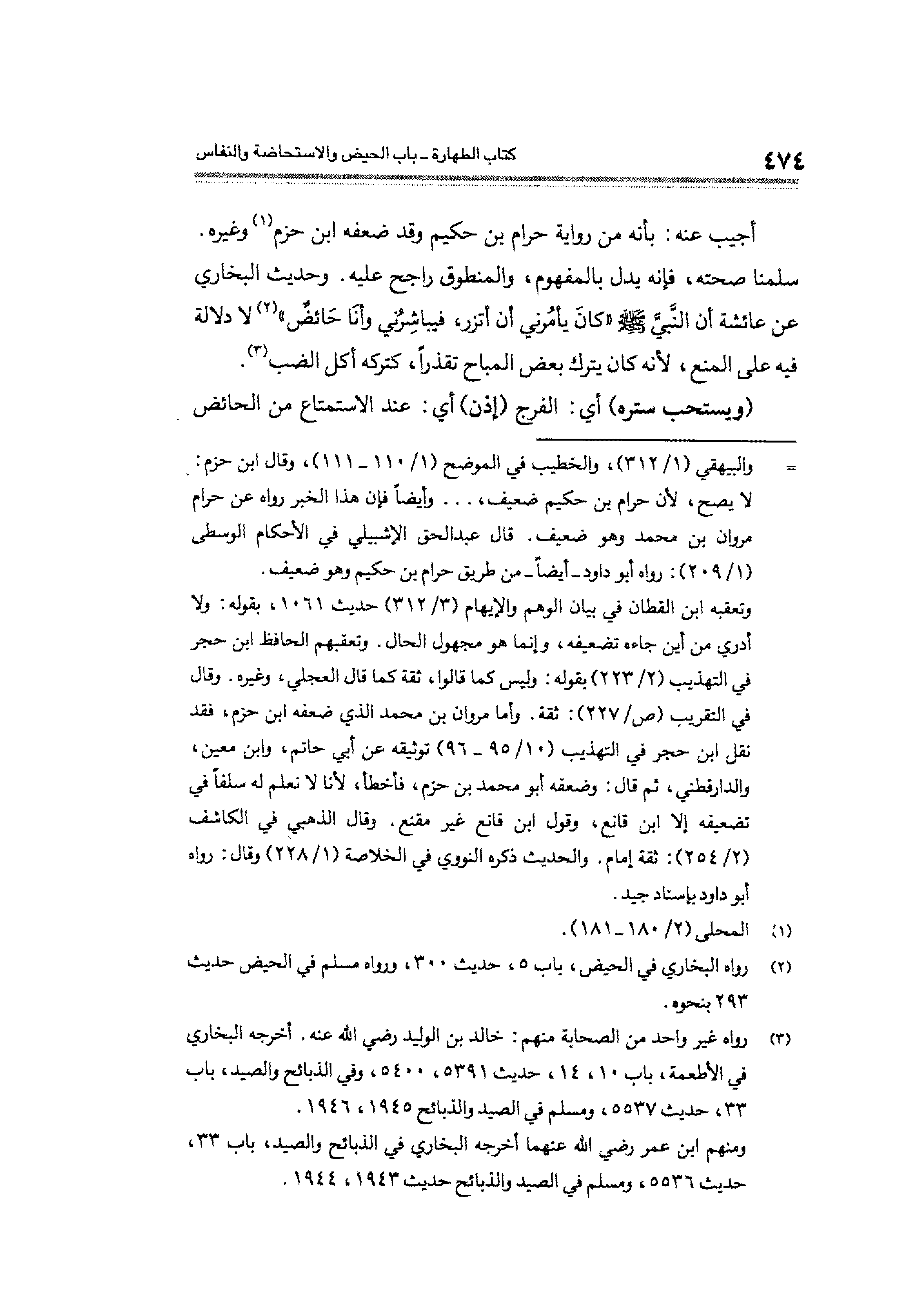 أجيب عنه: بأنه من رواية حرام بن حكيم وقد ضعفه ابن حزم (¬١) وغيره. سلمنا صحته، فإنه يدل بالمفهوم، والمنطوق راجح عليه. وحديث البخاري عن عائشة أن النَّبيَّ - صلى الله عليه وسلم - "كانَ يأمُرني أن أتزر، فيباشِرُني وأنَا حَائضٌ" (¬٢) لا دلالة فيه على المنع؛ لأنه كان يترك بعض المباح تقذرًا، كتركه أكل الضب (¬٣).