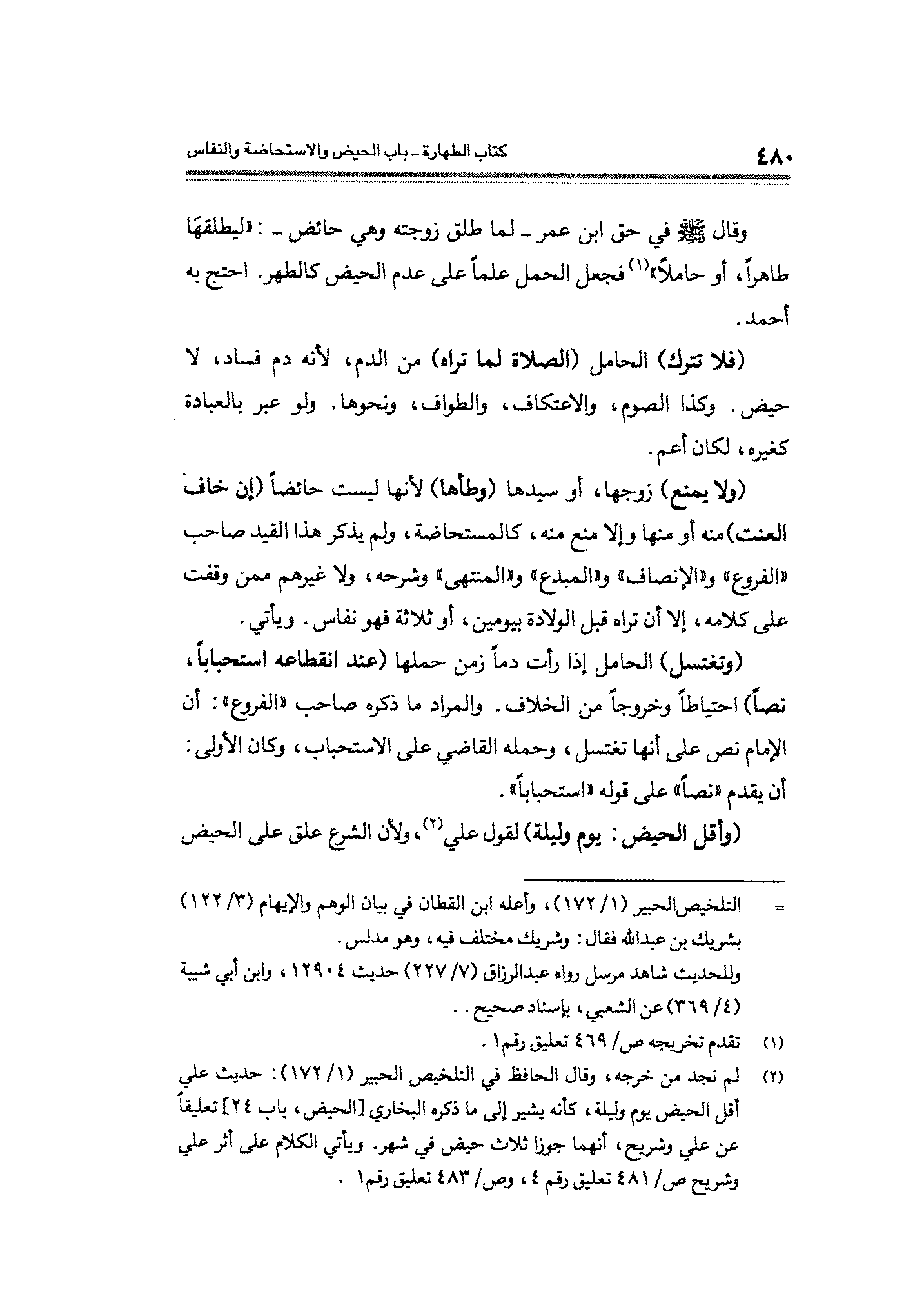 (¬٢) لم نجد من خرجه، وقال الحافظ في التلخيص الحبير (١/ ١٧٢): حديث علي أقل الحيض يوم وليلة، كأنه يشير إلى ما ذكره البخاري [الحيض، باب ٢٤] تعليقًا عن علي وشريح، أنهما جوزا ثلاث حيض في شهر. ويأتي الكلام على أثر علي وشريح ص / ٤٨١ تعليق رقم ٤، وص/٤٨٣ تعليق رقم ١.