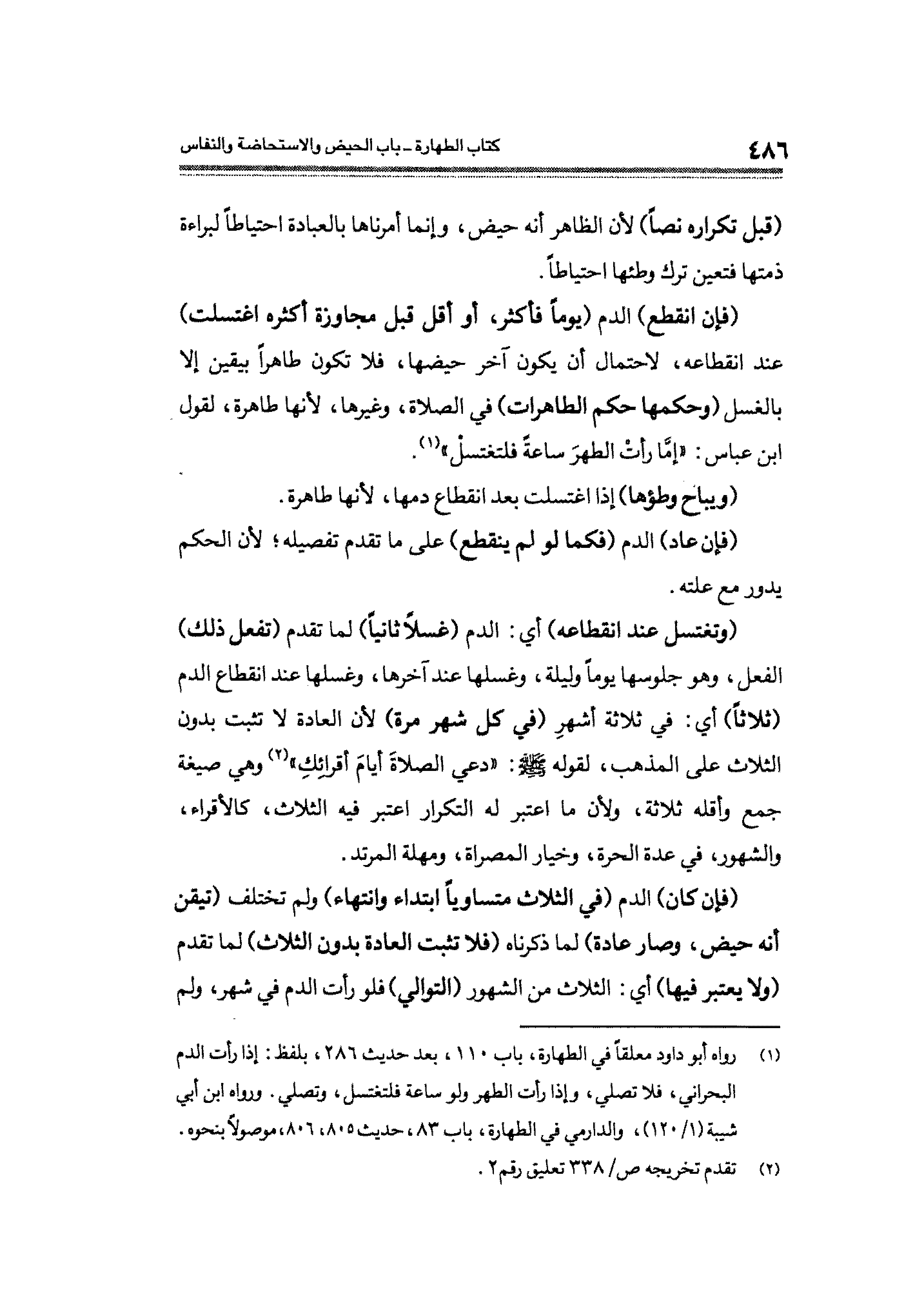 (¬١) رواه أبو داود معلقاً في الطهارة، باب ١١٠، بعد حديث ٢٨٦، بلفظ: إذا رأت الدم البحراني، فلا تصلي، وإذا رأت الطهر ولو ساعة فلتغتسل، وتصلي. ورواه ابن أبي شيبة (١/ ١٢٠)، والدارمي في الطهارة، باب ٨٣، حديث ٨٠٥، ٨٠٦، موصولاً بنحوه.