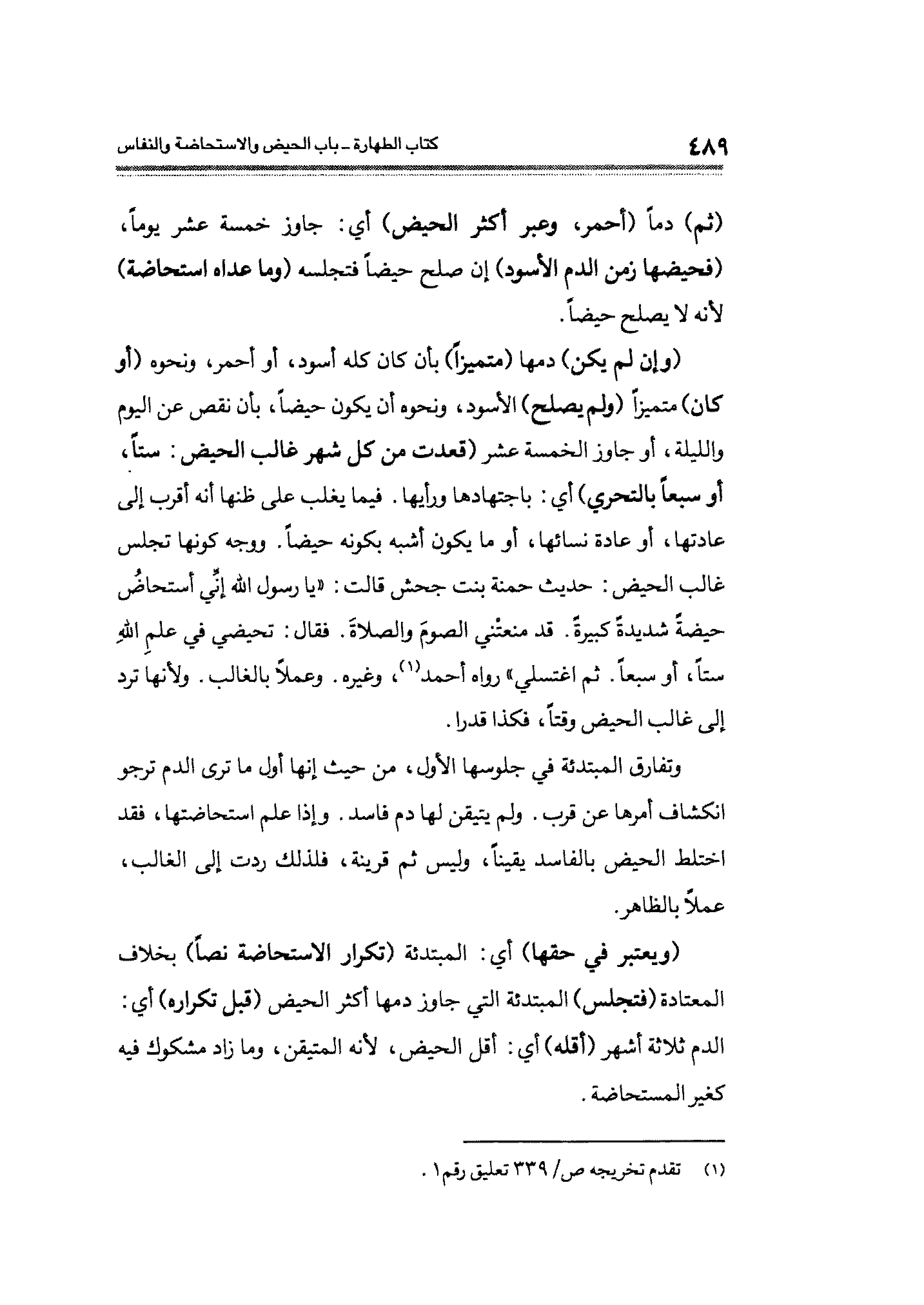 (وإن لم يكن) دمها (متميزاً) بأن كان كله أسود، أو أحمر، ونحره (أو كان) متميزاً (ولم يصلح) الأسود، ونحوه أن يكون حيضًا، بأن نقص عن اليوم والليلة، أو جاوز الخمسة عشر (قعدت من كل شهر غالب الحيض: ستاً، أو سبعًا بالتحري) أي: باجتهادها ورأيها. فيما يغلب على ظنها أنه أقرب إلى عادتها، أو عادة نسائها، أو ما يكون أشبه بكونه حيضاً. ووجه كونها تجلس غالب الحيض: حديث حمنة بنت جحش قالت: "يا رسول الله إني أستحاضُ حيضةً شديدةً كييرةً. قد منعتْني الصومَ والصلاةَ. فقال: تحيضي في علمِ اللهِ ستاً، أو سبعاً. ثم اغتسلي" رواه أحمد (¬١)، وغيره. وعملًا بالغالب، ولأنها ترد إلى غالب الحيض وقتاً، فكذا قدرا.
