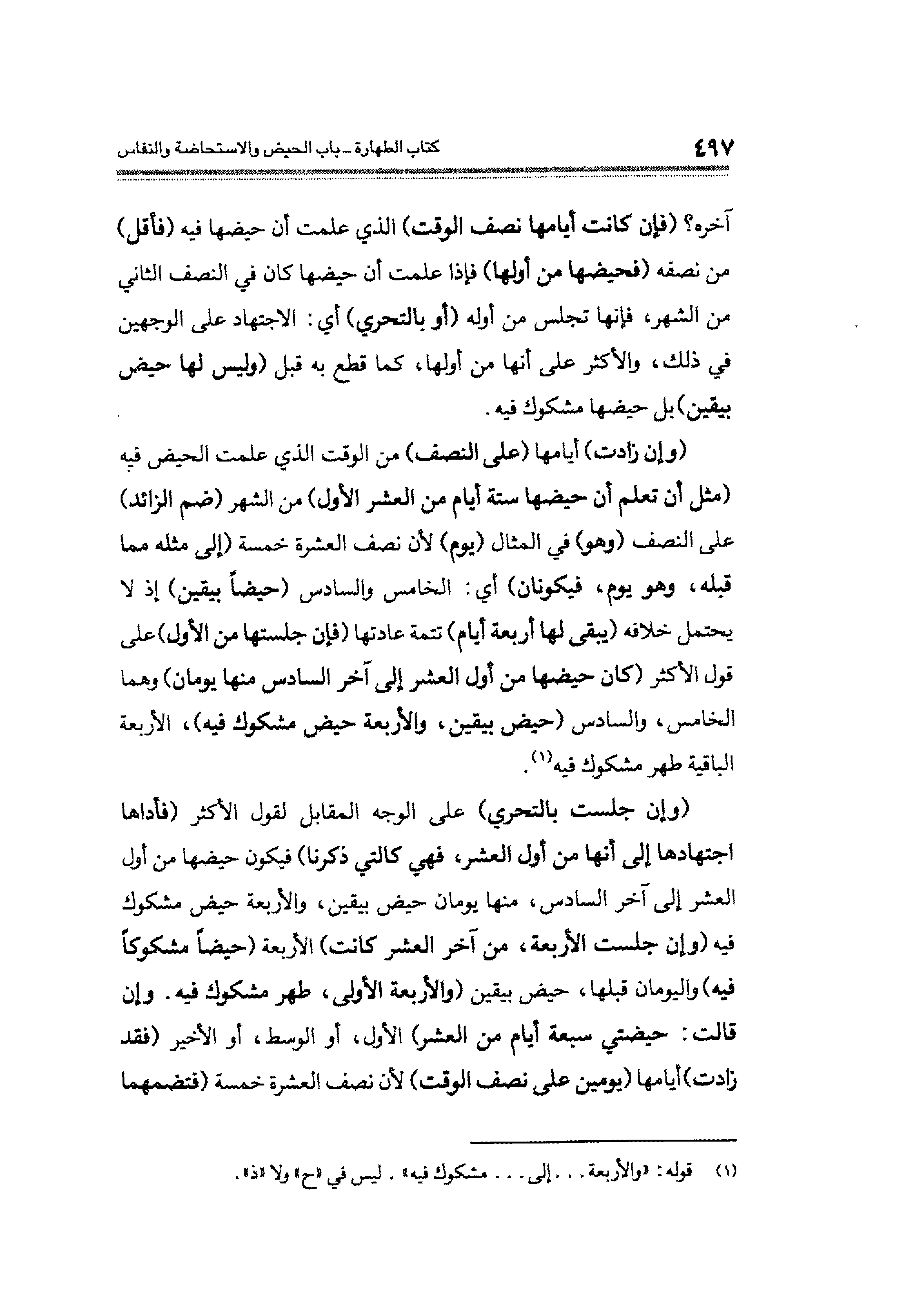 آخره؟ (فإن كانت أيامها نصف الوقت) الذي علمت أن حيضها فيه (فأقل) من نصفه (فحيضها من أولها) فإذا علمت أن حيضها كان في النصف الثاني من الشهر، فإنها تجلس من أوله (أو بالتحري) أي: الاجتهاد على الوجهين في ذلك، والأكثر على أنها من أولها، كما قطع به قبل (وليس لها حيض بيقين) بل حيضها مشكوك فيه.