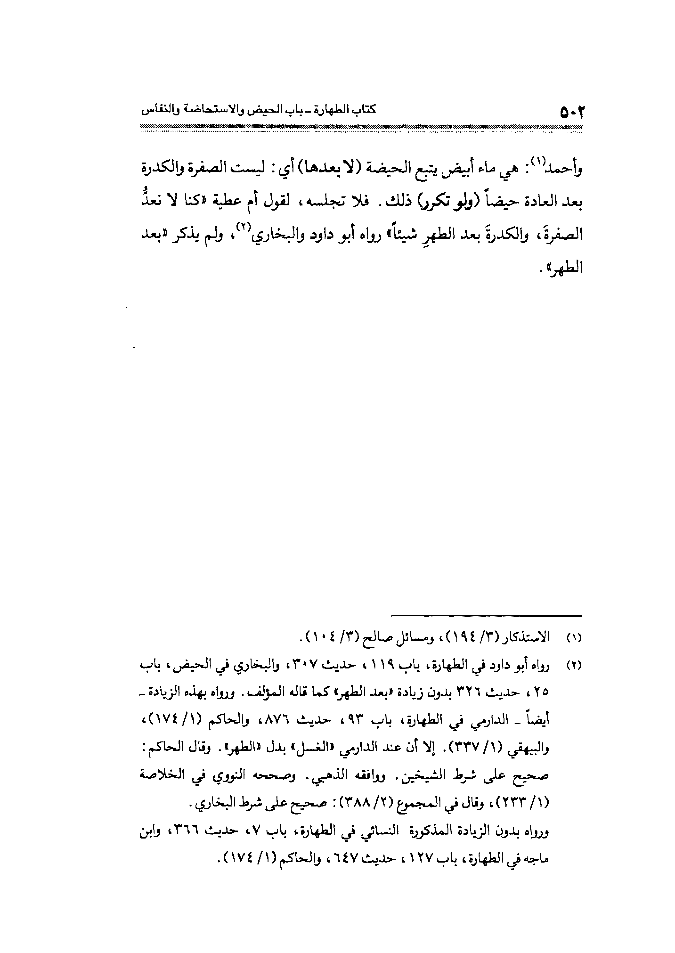 وأحمد (¬١): هي ماء أبيض يتبع الحيضة (لا بعدها) أي: ليست الصفرة والكدرة بعد العادة حيضاً (ولو تكرر) ذلك. فلا تجلسه، لقول أم عطية (كنا لا نعدُ الصفرةَ، والكدره بعد الطهرِ شيئاً، رواه أبو داود والبخاري (¬٢)، ولم يذكر "بعد الطهر".