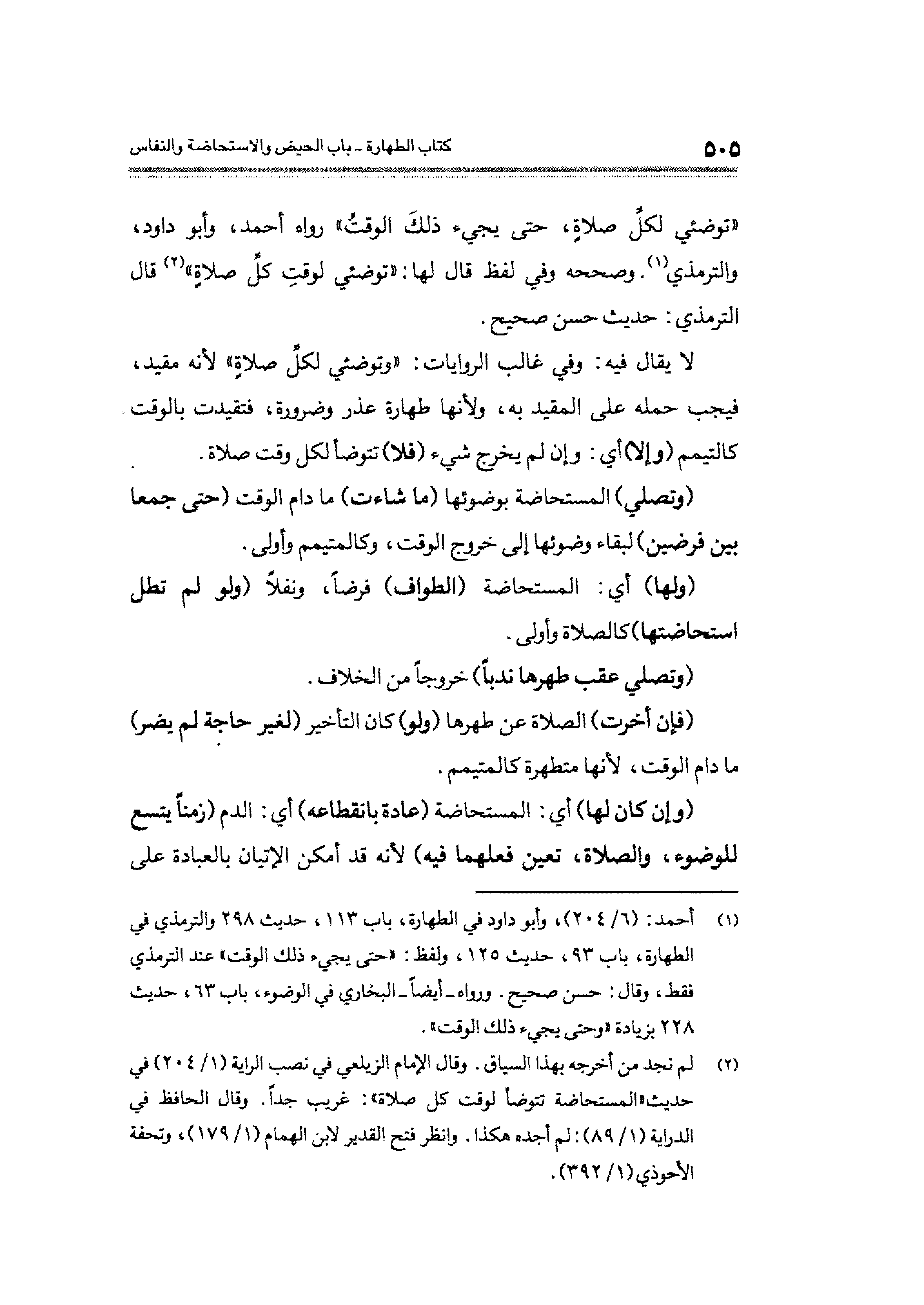 "توضئي لكل صلاةٍ، حتى يجيء ذلكَ الوقتُ" رواه أحمد، وأبو داود، والترمذي (¬١). وصححه وفي لفظ قال لها: "توضئي لوقت كلّ صلاةٍ" (¬٢) قال الترمذي: حديث حسن صحيح.