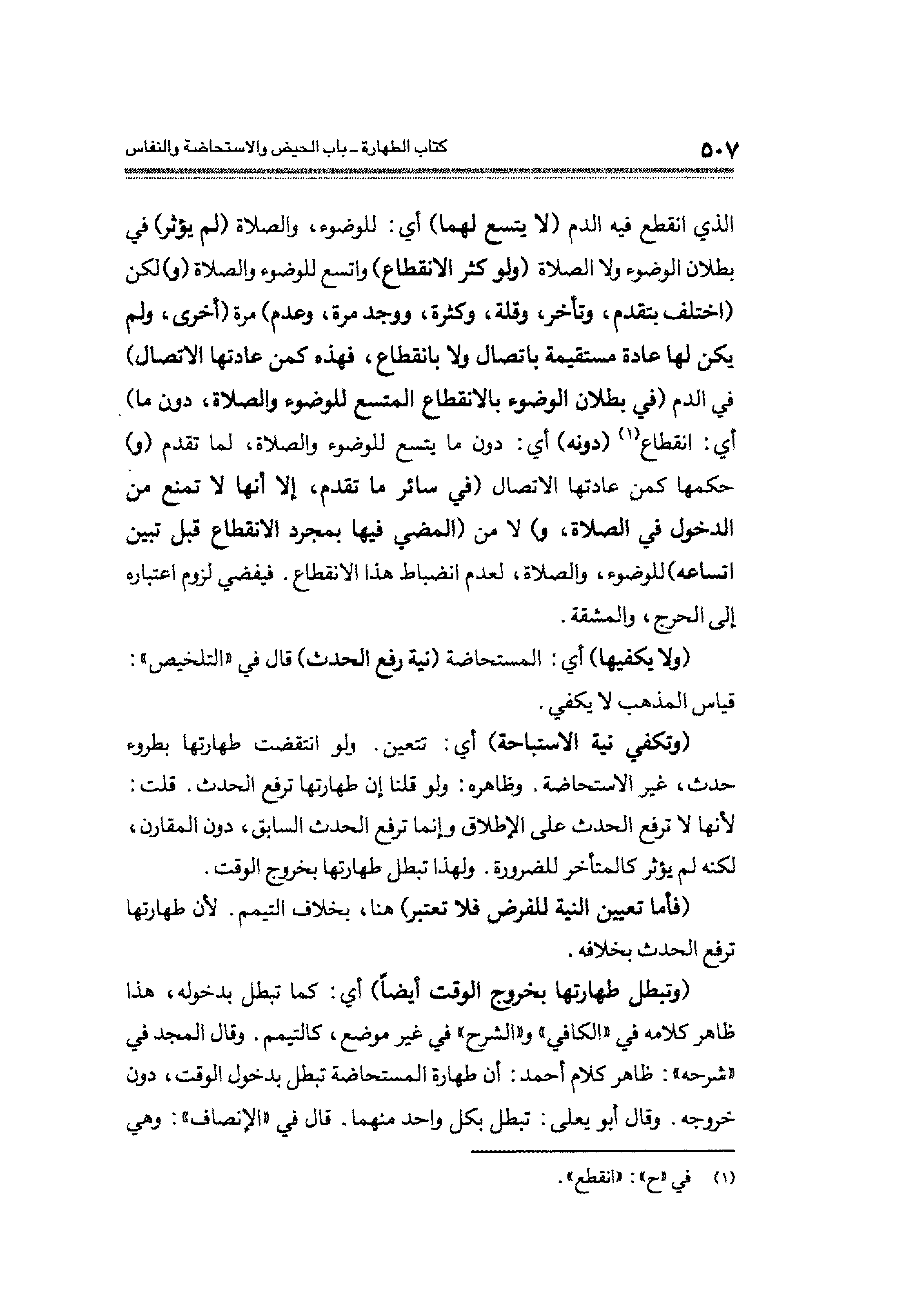 الذي انقطع فيه الدم (لا يتسع لهما) أي: للوضوء والصلاة (لم يؤثر) في بطلان الوضوء ولا الصلاة (ولو كثر الانقطاع) واتسع للوضوء والصلاة (و) لكن (اختلف يتقدم، وتأخر، وقلة، وكثرة، ووجد مرة، وعدم) مرة (أخرى، ولم يكن لها عادة مستقيمة باتصال ولا بانقطاع، فهذه كمن عادتها الاتصال) فى الدم (فى بطلان الوضوء بالانقطاع المتسع للوضوء والصلاة، دون ما) أي: انقطاع (¬١) (دونه) أي: دون ما يتسع للوضوء والصلاة، لما تقدم (و) حكمها كمن عادتها الاتصال (في سائر ما تقدم، إلا أنها لا تمنع من الدخول في الصلاة، و) لا من (المضي فيها بمجرد الانقطاع قبل تبين اتساعه) للوضوء والصلاة، لعدم انضباط هذا الانقطاع. فيفضي لزوم اعتباره إلى الحرج، والمشقة.