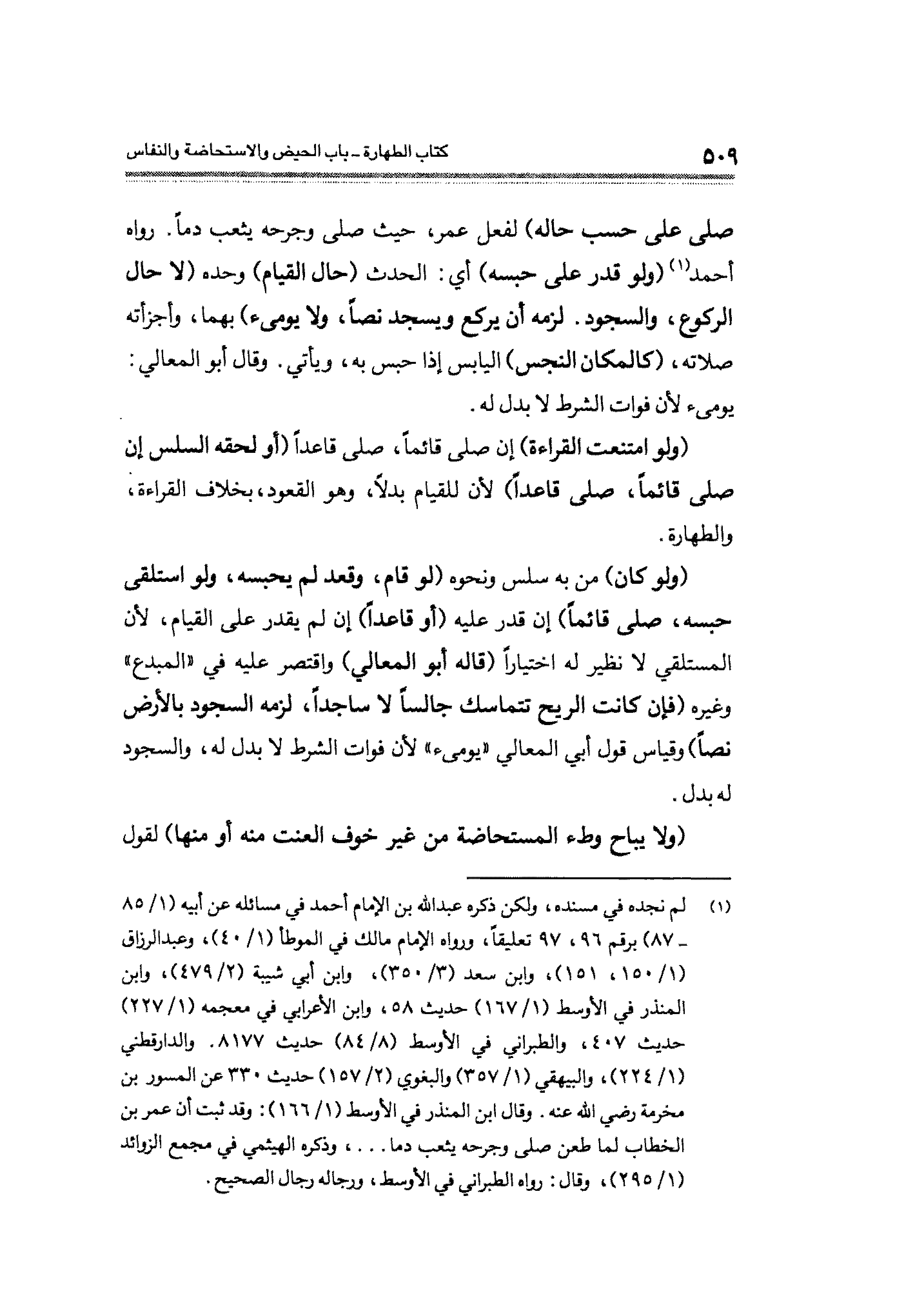 صلى على حسب حاله) لفعل عمر، حيث صلى وجرحه يثعب دمًا. رواه أحمد (¬١) (ولو قدر على حبسه) أي: الحدث (حال القيام) وجده (لا حال الركوع، والسجود. لزمه أن يركع ويسجد نصاً، ولا يومئ) بهما، وأجزأته صلاته، (كالمكان النجس) اليابس إذا حبس به، ويأتي. وقال أبو المعالي: يومئ لأن فوات الشرط لا بدل له.