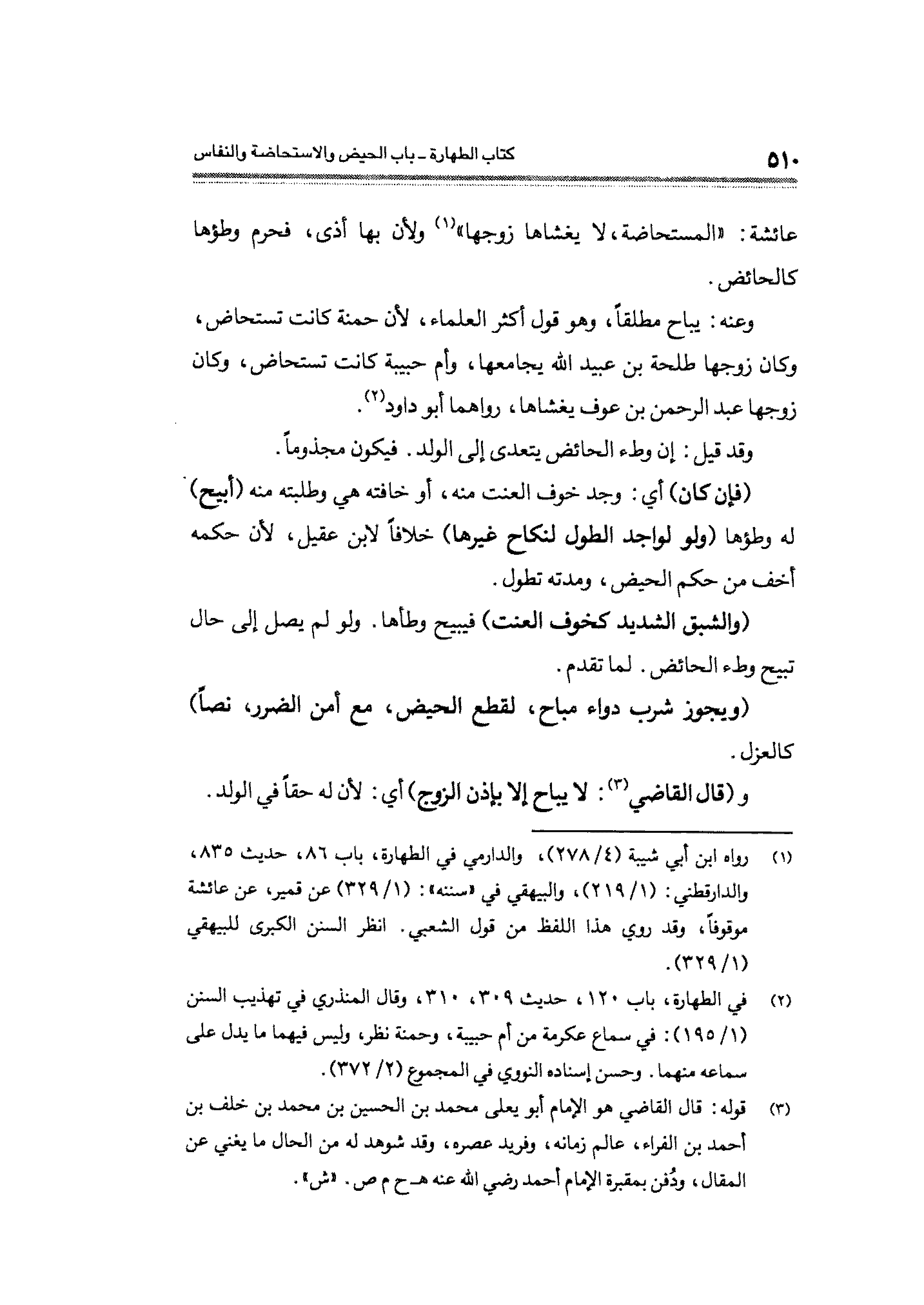وعنه: يباح مطلقًا، وهو قول أكثر العلماء، لأن حمنة كانت تستحاض، وكان زوجها طلحة بن عبيد الله يجامعها، وأم حبيبة كانت تستحاض، وكان زوجها عبد الرحمن بن عوف يغشاها، رواهما أبو داود (¬٢).
