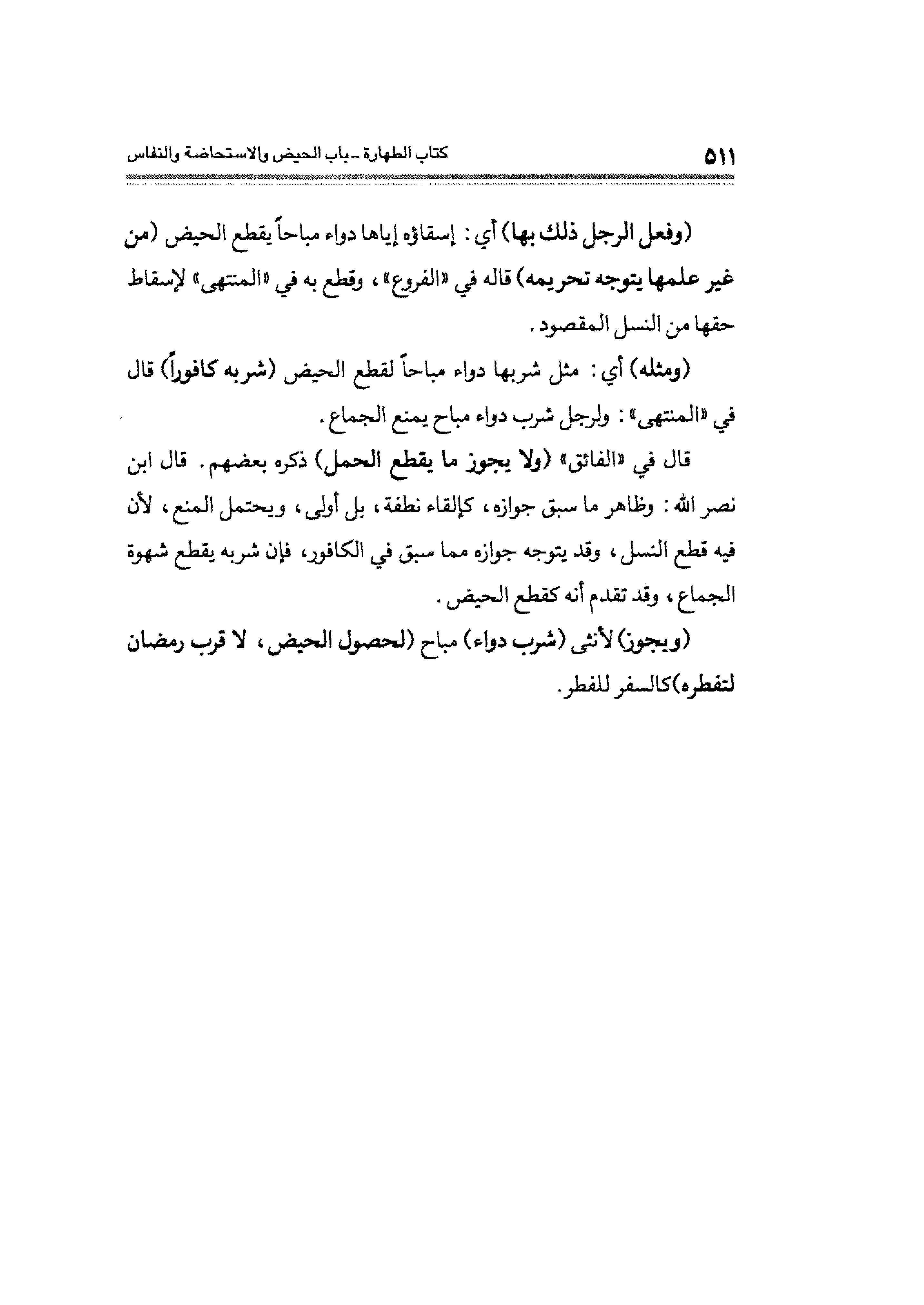 (وفعل الرجل ذلك بها) أي: إسقاؤه إياها دواء مباحًا يقطع الحيض (من غير علمها يتوجه تحريمه) قاله في "الفروع"، وقطع به في "المنتهى" لإسقاط حقها من النسل المقصود.