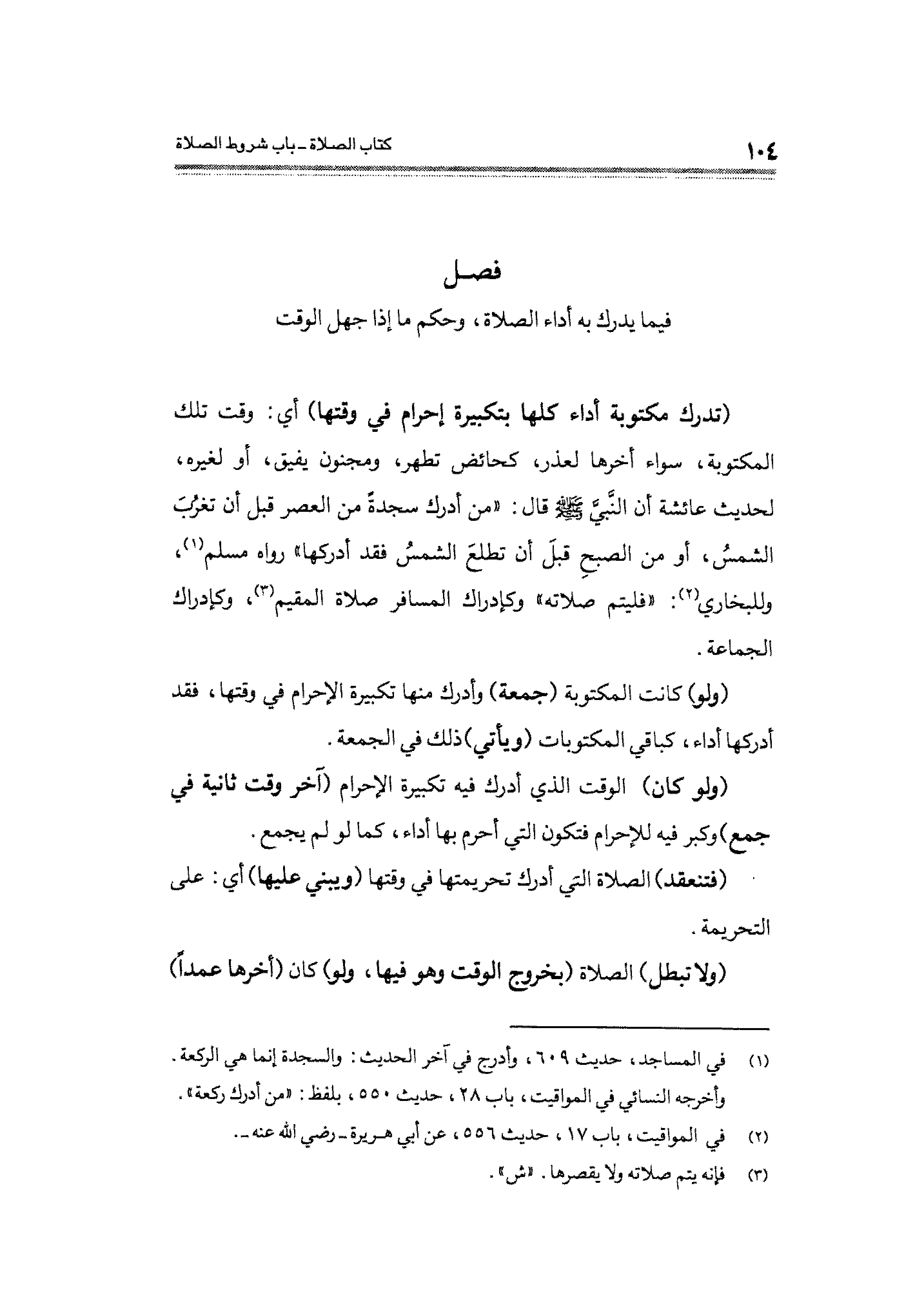 (تدرك مكتوبة أداء كلها بتكبيرة إحرام في وقتها) أي: وقت تلك المكتوبة، سواء أخرها لعذر، كحائض تطهر، ومجنون يفيق، أو لغيره، لحديث عائشة أن النَّبيَّ - صلى الله عليه وسلم - قال: "من أدرك سجدةً من العصر قبل أن تغرُبَ الشمسُ، أو من الصبح قبلَ أن تطلعَ الشمسُ فقد أدركها" رواه مسلم (¬١)، وللبخاري (¬٢): "فيتم صلاته" وكإدراك المسافر صلاة المقيم (¬٣)، وكإدراك الجماعة.