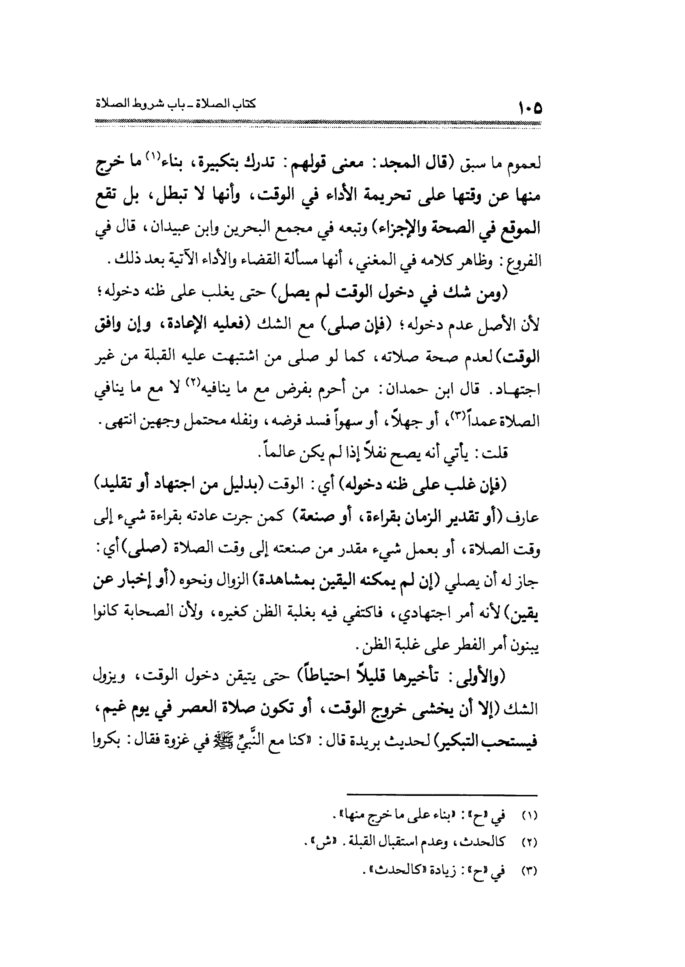 (والأولى: تأخيرها قليلًا احتياطًا) حتى يتيقن دخول الوقت، ويزول الشك (إلا أن يخشى خروج الوقت، أو تكون صلاة العصر في يوم غيم، فيستحب التبكير) لحديث بريدة قال: "كنا مع النَّبيَّ - صلى الله عليه وسلم - في غزوة فقال: بكروا